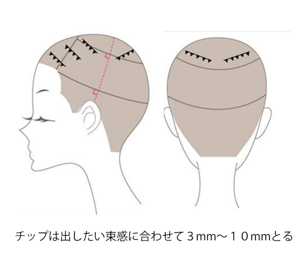 ハイライトは、カットで出した束感と同じ幅のチップで動きを更に強調させるイメージです。フォイルは少ない枚数(8~10枚程度)で配置します。