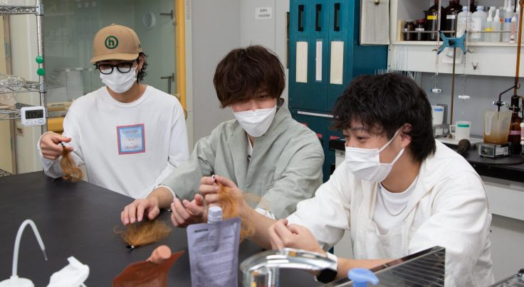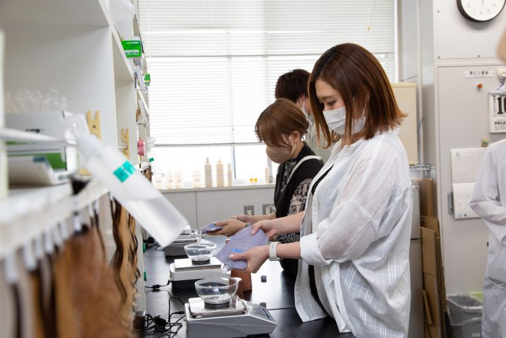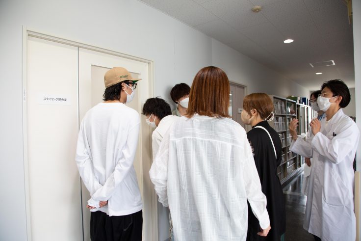 滋賀県にあるタカラベルモント株式会社化粧品研究開発センターを訪れた5人。最初はヘアケア開発室やヘアカラー開発室、スタイリング開発室、機器分析室などを見学。初めて見る機器や装置に興味津々 。