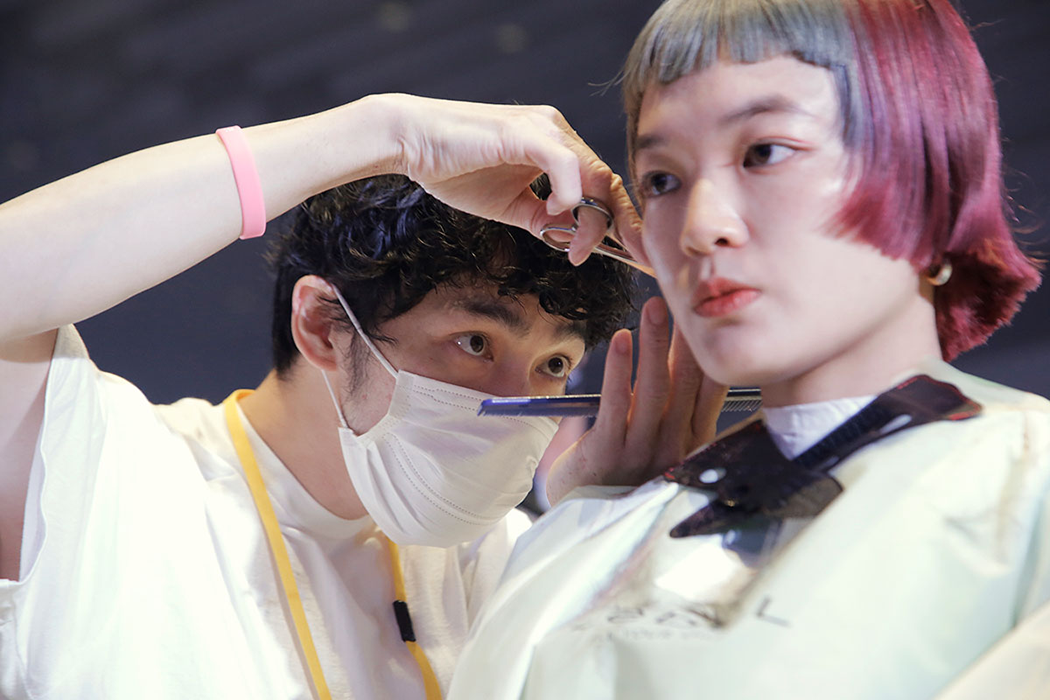 • 自分らしい装いで戦いに挑む姿は真剣そのものです。30分間、自由に大胆にヘアスタイルをつくり、残り1分を切った頃にはクロスがはずされ、モデルさんの全貌が明らかになると会場からどよめく声が……!終了の合図とともに張り詰めた空気が解かれ、出場者の方々が安堵の表情に変わりました。