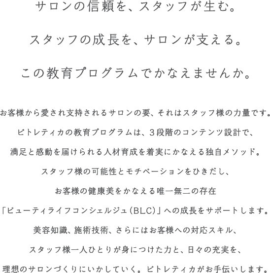 ストレスや毎日の生活習慣によって髪の悩みは人それぞれ。ピトレティカ(pittoretiqua) はお客様一人ひとりのライフスタイルにあった健康美をサロンと一緒に提案、導き、育んでいくブランドです。