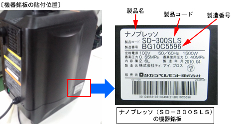 「ナノプレッソ」と「ナノプレッソN」をお使いのお客様各位におかれましては、製品に貼付しております機器銘板の製造番号をご確認の上、該当するものがございましたら、ぜひとも弊社までお知らせいただきますよう、よろしくお願い申し上げます。