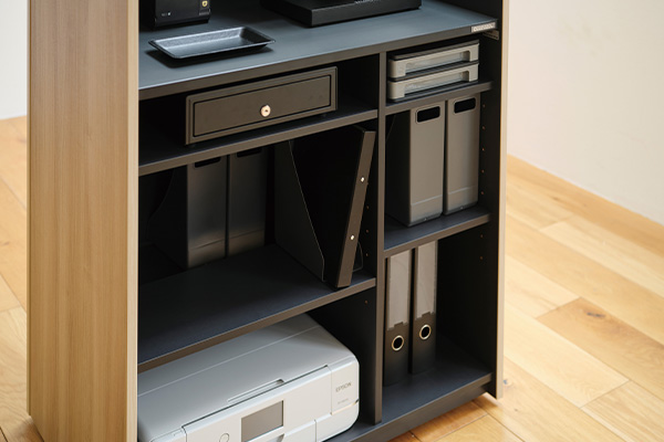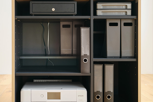 前後で棚板の高さを変えられるので、収納物によってアレンジ可能。奥にはケーブルスペースも確保。