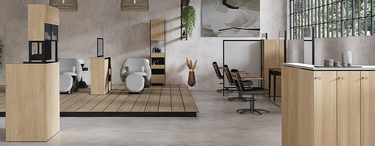 SALON DESIGN FURNITURE サロンフロントラインは、サロンワークに必要な機能を家具に置いてください。常にお客さまに目を配れるおもてなしと、スタッフの作業効率アップを同時に実現します。いるため、空間に合わせて柔軟にレイアウトを変えることができます。