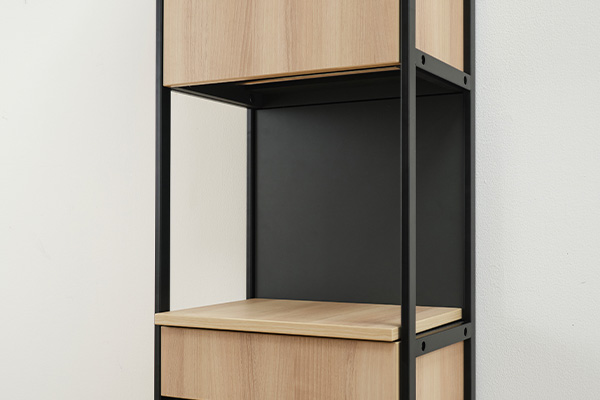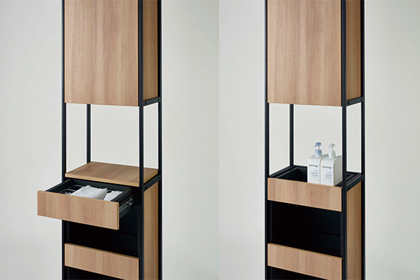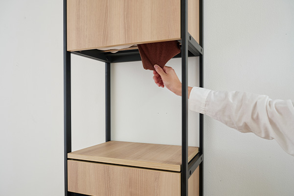 用途に合わせて着脱可能な上部棚。埃を避けたい小物類はそのまま引き出しとしても使用可能です。