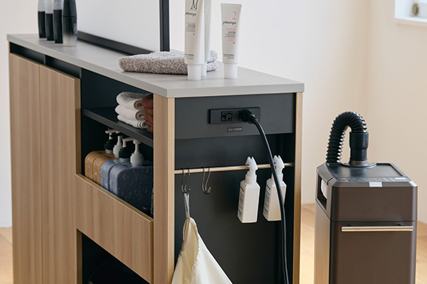 促進器などに使えるコンセントと、ケープや備品類を掛けることができるハンガー付き。
