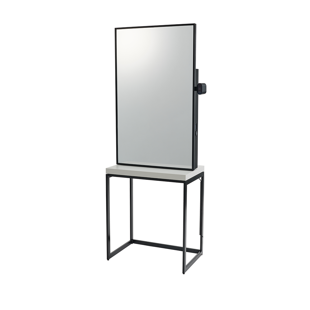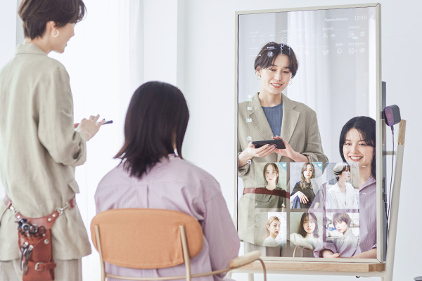 ミラー上に画像や動画を映し出し、来店中のコミュニケーションをサポートするスマートデバイスミラー。ミラーを通じて操作・紹介した内容は、カルテやお客様マイページに自動的に連携し、業務効率化にも繋がります。 -