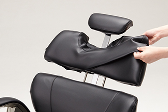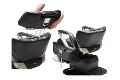 お子様やロングヘアのお客様を施術しやすい背もたれ分離タイプ。取り外した背もたれ上部は、専用のホルダーに簡単に収納可能です。