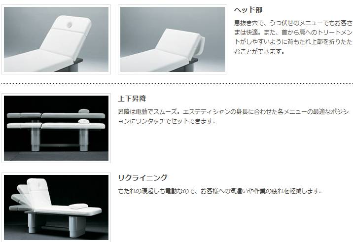 あらゆるエステティックメニューに対応するハイクオリティベッド