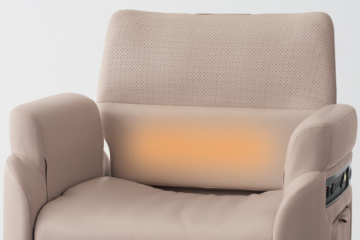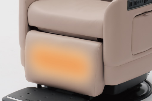 レッグレスト部にヒーターを内蔵。ヘッドスパやフェイシャルケアなどを行う寝姿勢時に、足元を温め、くつろぎ感を高めます。