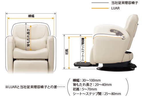 女性技術者がカットしやすいよう、初高を低く、横幅もダウンサイジング。さらに背もたれも低くくし、女性のロングヘアを扱いやすくしました。また、座った時に、小柄なお客様でもしっかりと足をステップに乗せられるよう、シート~ステップ間の距離も短くするなど、LUARは多機能チェアとして、これまでにないコンパクト設計を実現しました。