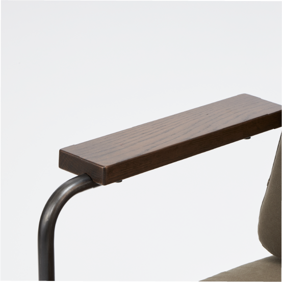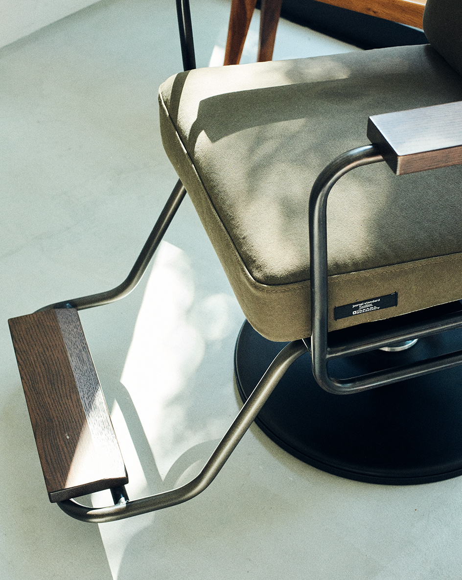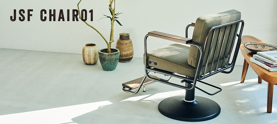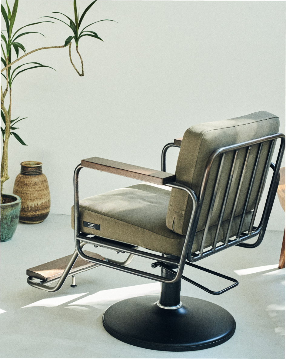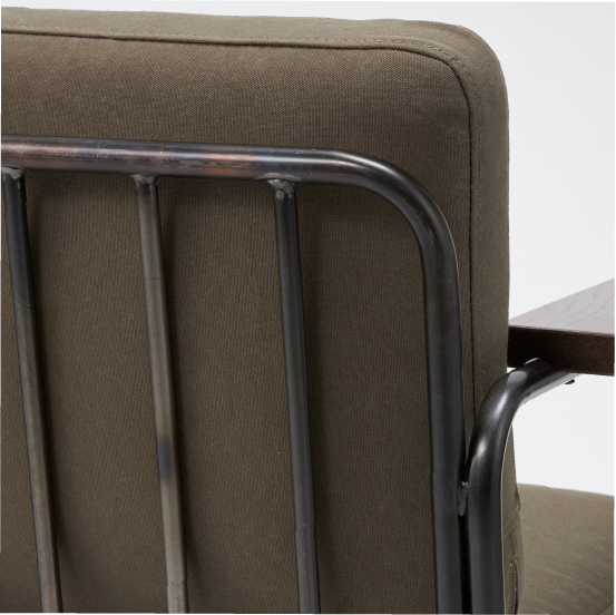シンプルなスクエアクッションとアイアンフレームの組み合わせが素材の表情を引き立て、サロン空間を彩るニュートラルなモデル。ミリタリー調ファブリックのライトブラウンとカーキ、ヴィンテージ風レザーのダークブラウンの3色展開。クッションカバーの着せ替え可能。