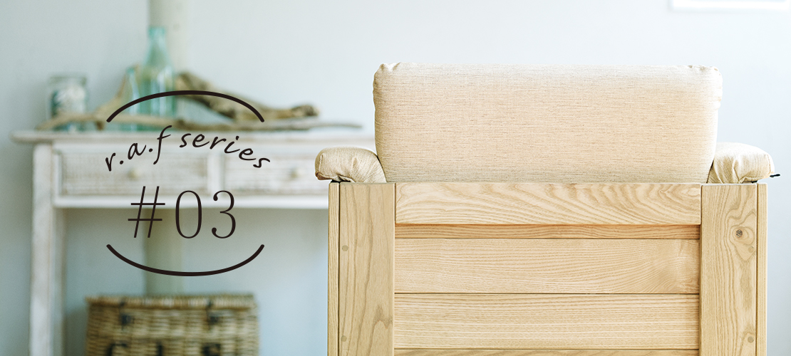 まるで木箱の中にクッションを詰め込んだような、大胆な意匠のモデル。座る人を四方向からラフ感タップリの木材とクッションで包み込み、優しく迎え入れます。自分が空間の一部になったような一体感を得られる、包容力のある逸品です。