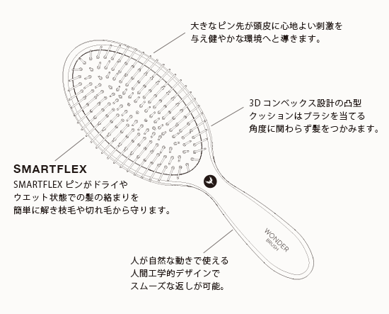 独自開発のSMARTFEXピンが簡単に髪の絡まりやもつれを簡単に解くことでダメージを抑え、3Dコンベック設計の凸型クッションが髪にテンションを加えツヤ髪へ導きます。