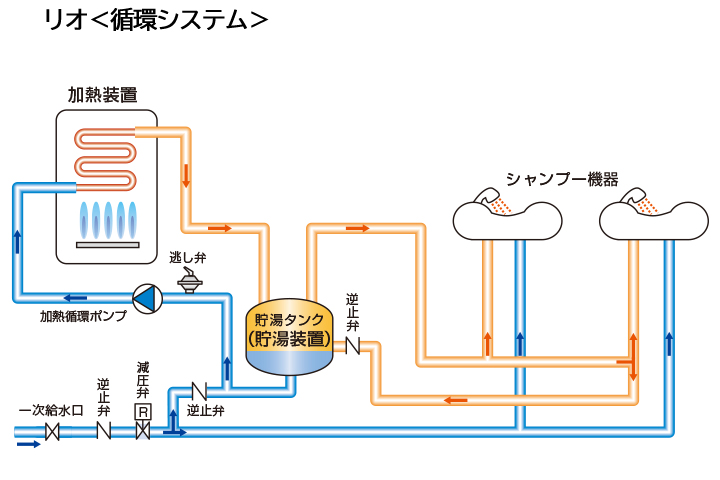 シャンプー台と貯湯装置の間でお湯が循環しているので、捨て水も少なく即時出湯できます。