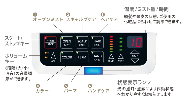 湿熱促進器。微細ミストの温度と量を自在にコントロールし、ヘッドスパやケアメニューを適切にサポート。