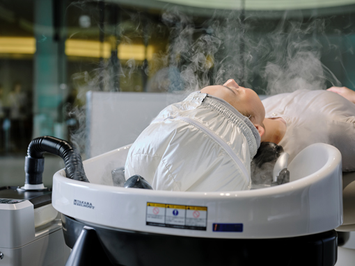 クーリング機能によってトリートメントや酸性カラーを毛髪にしっかり定着。ミスト加温とクーリングによって持続性が高くなります。