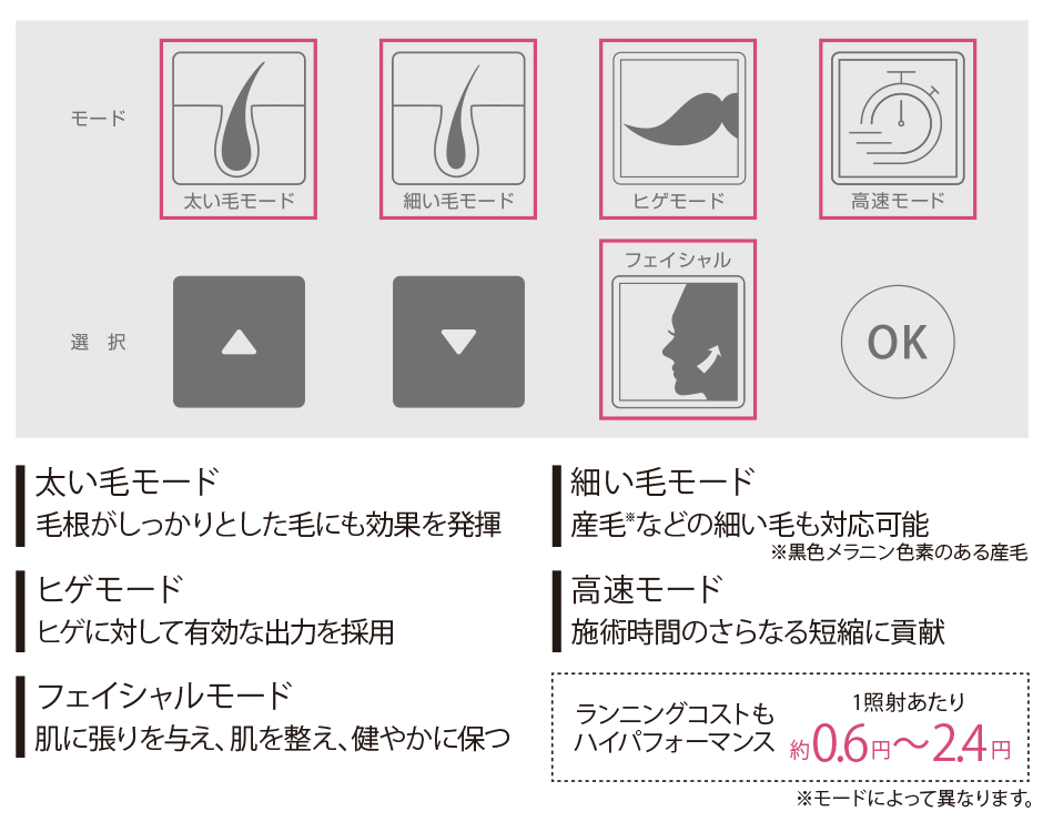 お客様一人ひとりの毛質、肌質に合わせてモードとレベルを細かく選んで施術できます。