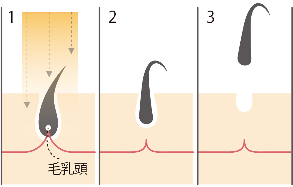 光を照射し、毛に栄養を届ける役割を持つ「毛乳頭」に働きかけます。数日後、毛が抜け落ちて毛穴が収縮。これを繰り返すことで、細く薄い毛へと変化していきます。