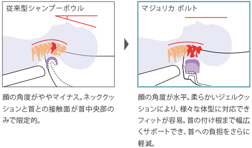 ボウル内に固定された厚みのある柔らかなジェルクッションが、お客さまの首にかかる負担を分散。首がほぼ水平で、安定した姿勢となり寝心地がより快適に。固定タイプなので、作業中にズレることがなく、施術者はシャンプーワークに集中できます。またネックデバイスは簡単に着脱できて、お手入れも簡単です。