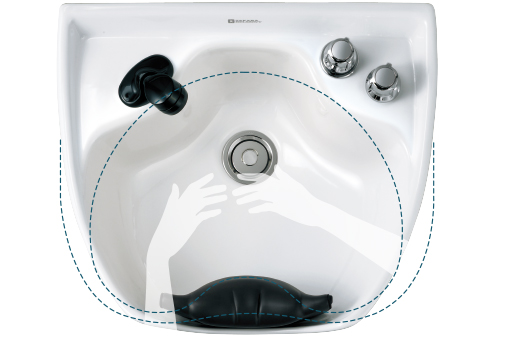 施術に必要なスペースを最大限に広くとるため、ボウルの奥行き方向を広くし、ボウルの底もより深く。ロングヘアのお客さまにも、ゆったりと余裕のあるシャンプーワークが可能です。また、ボウルのサイド部分は無駄な厚みを省きシャープな設計に。お客様により近づいて、手が届きにくい反対側の耳裏まで洗いやすくなっています。
