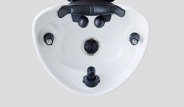 シャワーヘッドを後方真中に、止水・サーモ温調コックを左右対称にボウル内へ配置。シャンプーや中間水洗、ヘッドスパなど多彩なシーンでの使いやすさを考えたレイアウトです。