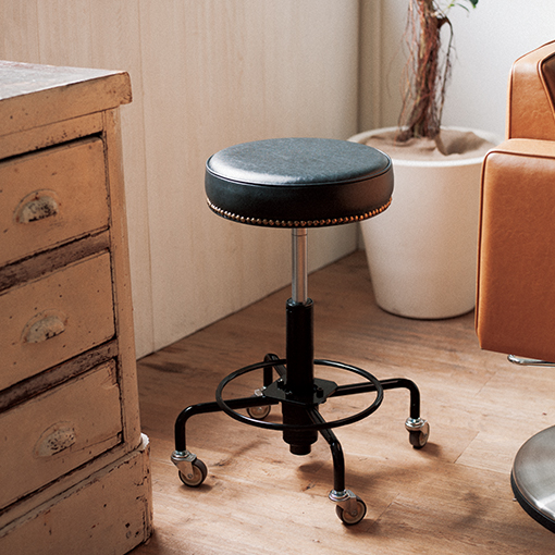 シンプルなフォルムとエイジング加工を施したディテールが織りなす、荒々しい魅力。背もたれの鋲と特殊ビス、エイジング仕上げのウッド手すり・ステップと金属フレームが、アンティーク感を際立たせます。 -