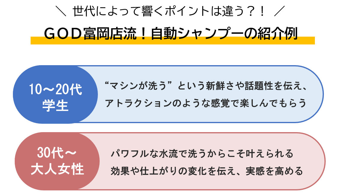 「子どもからシニアの方まで幅広いお客さまにご来店いただくのですが、中学生以上のすべての方に「一回試してみませんか?」とお伝えするようにしています。中高生だと、「やってみる?おもしろいよ。学校の話題づくりにどう?」と伝えて興味を持ってもらったり、年齢によってすこし伝え方を変えていて、ほとんどの方は自動シャンプーを体験してくれますし、2回目以降もリピートしてくれますね。」(飯塚さん)