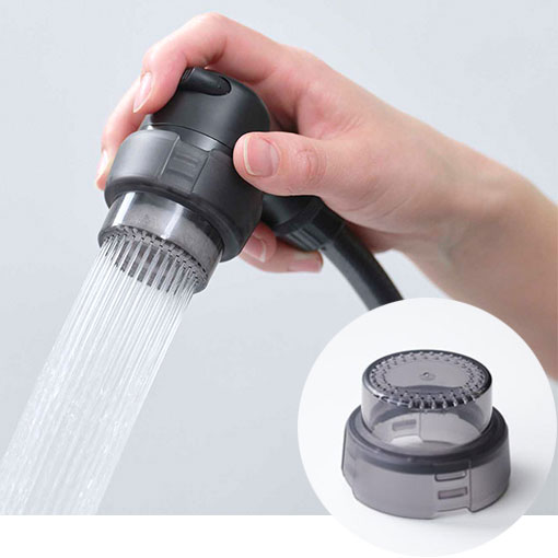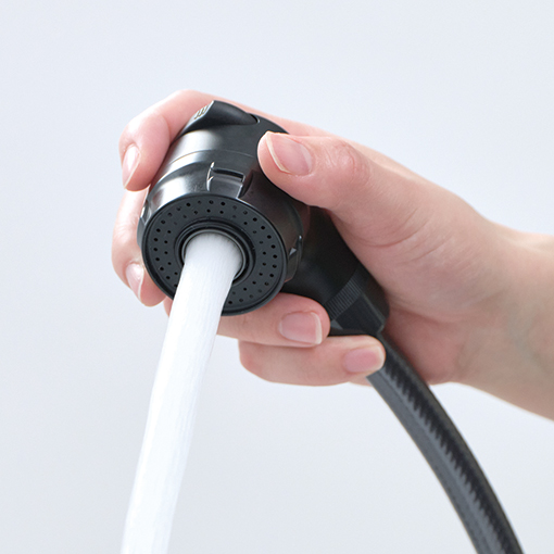 節水機能はそのままに、手の小さい方でも握りやすいよう小型化。ネープに入れやすく、泡沫とシャワーを切り替えて使用することで、効率よく洗い流すことができます。