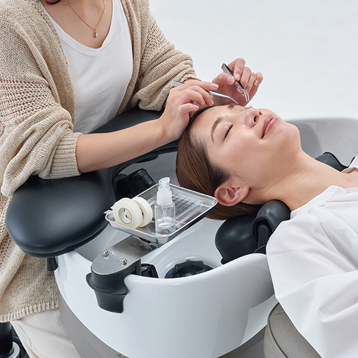 専用のスペースがなくても、ボウルに取り付けるだけで快適なアイラッシュ施術を叶えるアイラッシュデバイス。空いているシャンプー台を有効に活用することができ、トリートメントなどのプロセスタイムを利用して複合率がアップします。