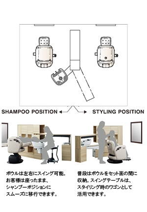 ボウル内にフラットなスペースをもうけました。小物やケア剤などを置くことができ、施術効率が向上します。