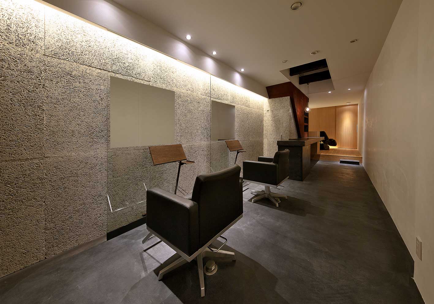 素材は墨調モルタルに漆喰壁と和の雰囲気のあるもので全体を統一し、スタイリングは木毛セメント板や鉄の赤錆などラフで実験的なものを、シャンプーはタモ材のフローリングや壁に床間接照明などで安らぎと温かみのあるものを用いるなど、オーナーの姿勢やこのテナントの特性を考慮してフェイクは極力使わずに、素材感のあるリアルなものを選んだ。