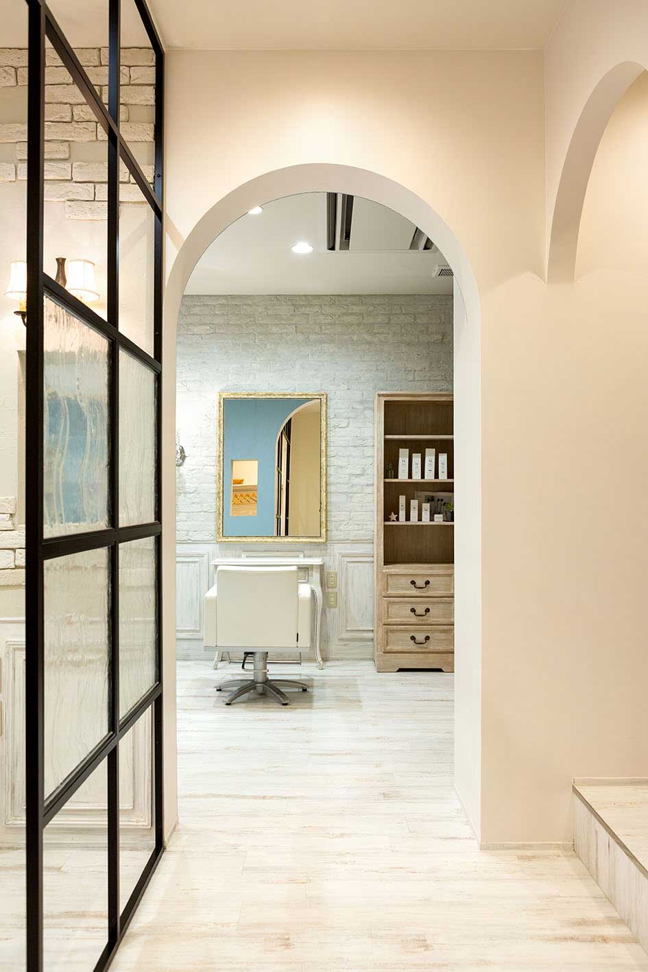 ブリックタイルやエイジング塗装によるフレンチシャビ—な空間。色調を統一し素材感や照度を変え、個々のブースの存在感を表現した。