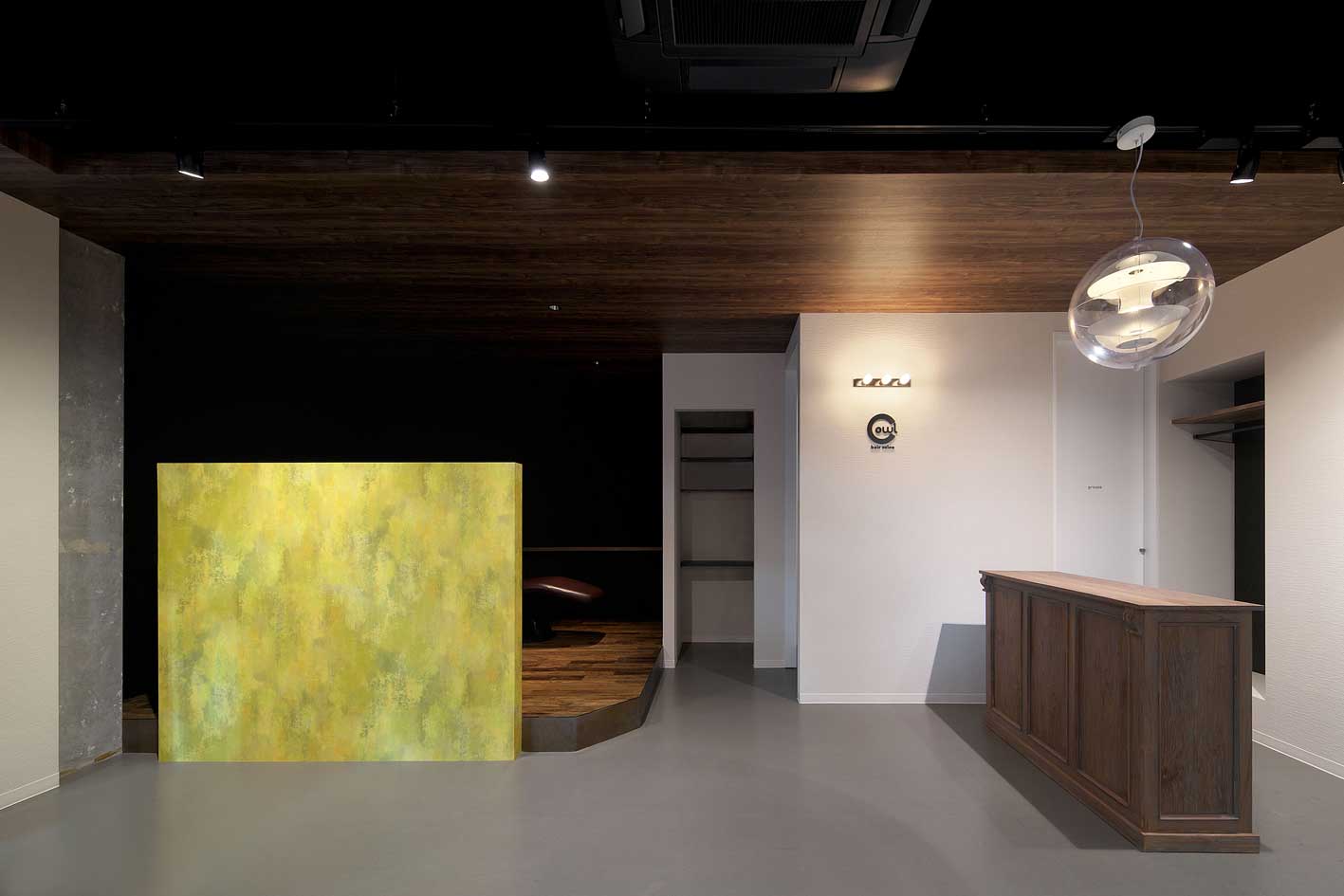 既存の個室をできるだけ利用しながら店内を広く見せられるよう、あえてレセプションカウンターを奥に配置した平面計画に。在来天井をくり抜くように躯体を表し、開放的な空間に締まりを与える。オーナーこ‘希望のモルタル調の床をベースに色彩を検討し、木や革といった天然素材のフェイクを使いながら、思い切ったアクセント色を取り入れた。