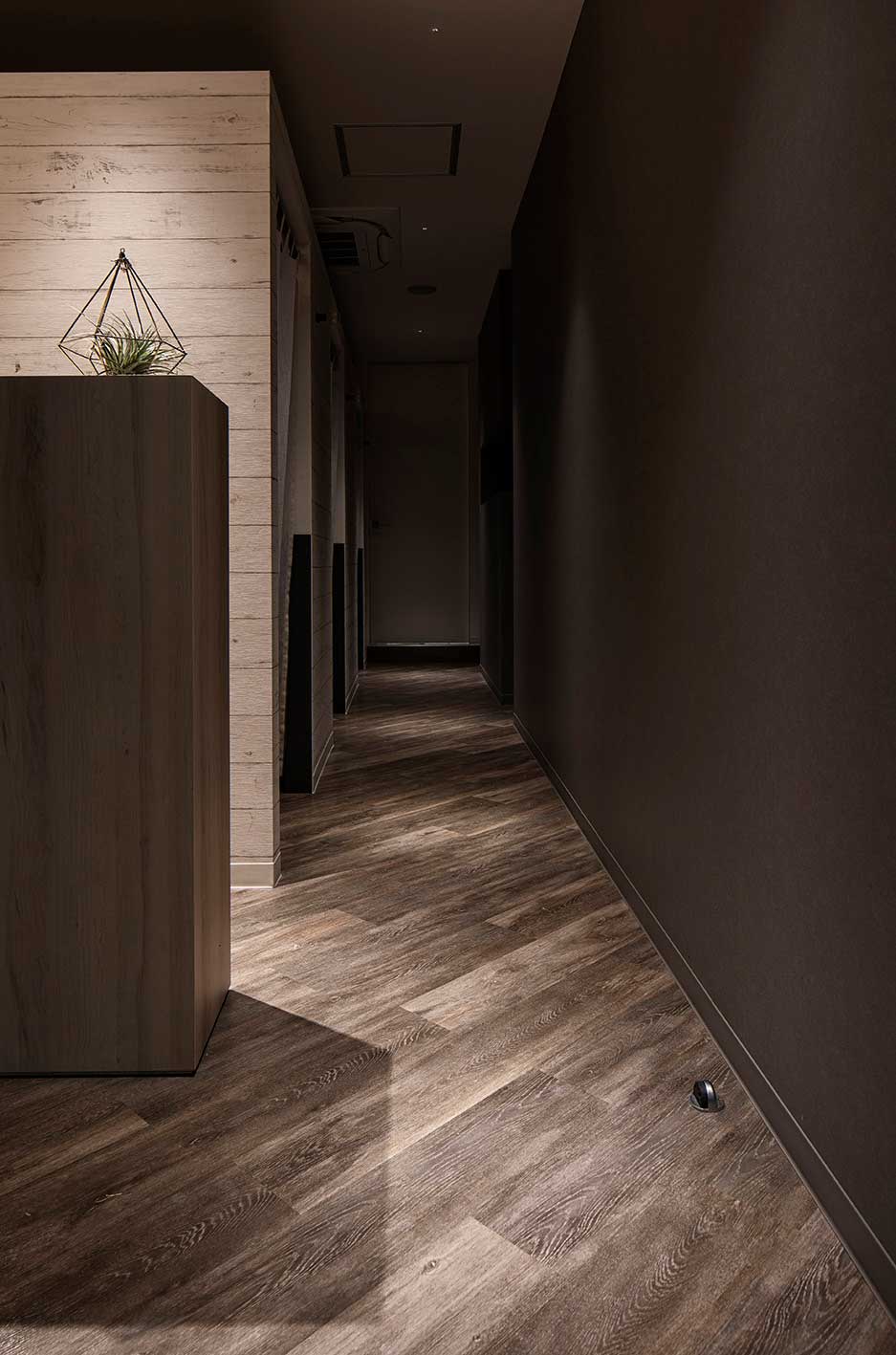 会社やオフィスが多い東陽町と、飲食店や住宅街が多い木場の中間地点に存在するバーバーサロン。ビジネスマンをターゲットとしている。店名の「PORTE HOMME」は直訳すると「男性の扉」。大通りから少し外れた静かな立地にポツンと現れるお店。入口の扉から長い光だまりの廊下を進み、個室のカーテンを開くと自分だけの贅沢な空間が広がる。最高級な理容椅子と各部屋ごとに調光可能なライティングで、日々の疲れを癒し、自分だけの空間でホッと一息ついてもらいたい。