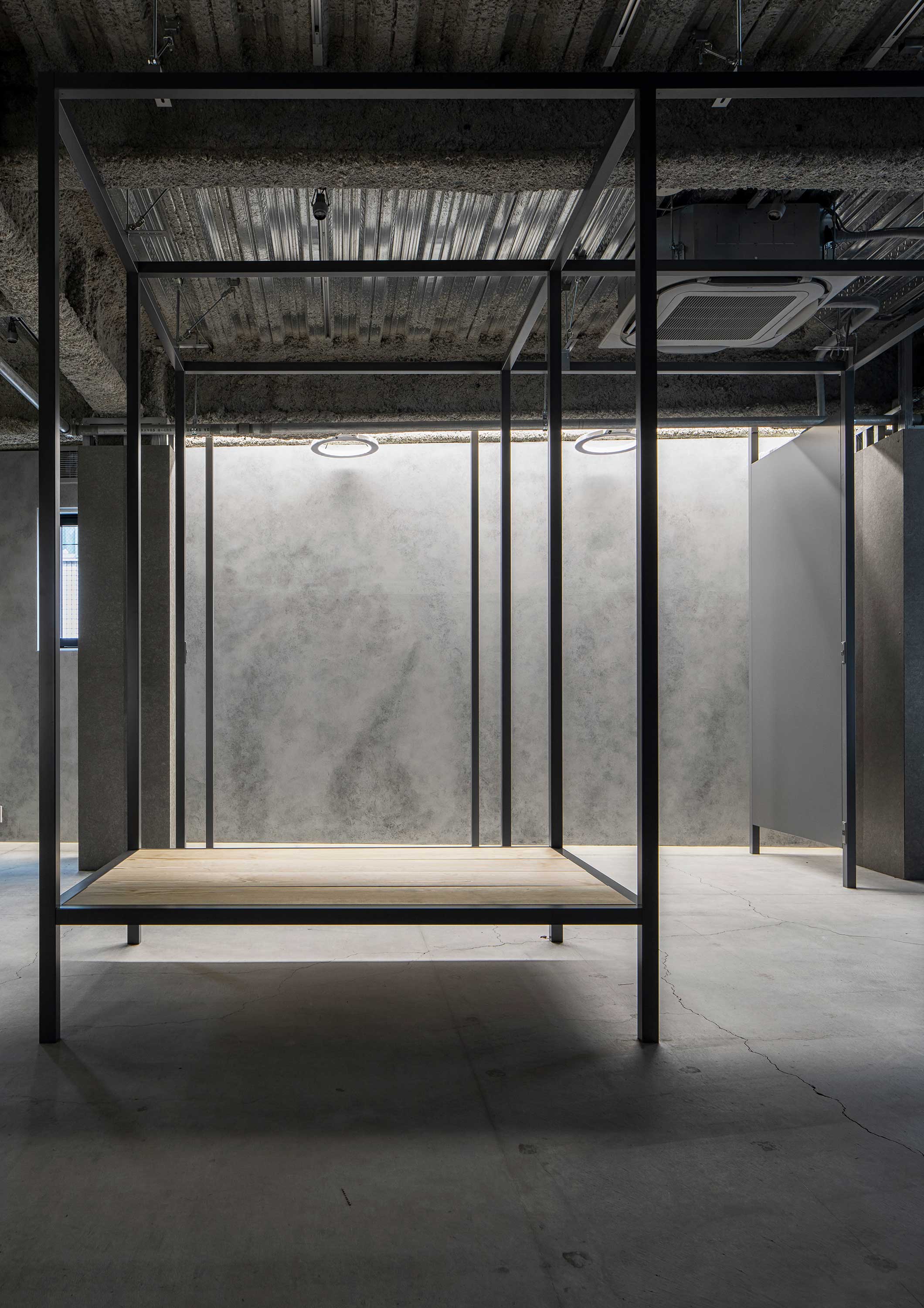 グリッドはさらに照明ダクトレールのためのカバーとなり、またサロン内の大量の配線を隠すインフラルートの役を担う。インダストリーな空間から「粗さ・雑さ」を少し取り除いて、「品」やプロダクトのような「完成度」を加えることで空間のオリジナリティとして表現を試みた。