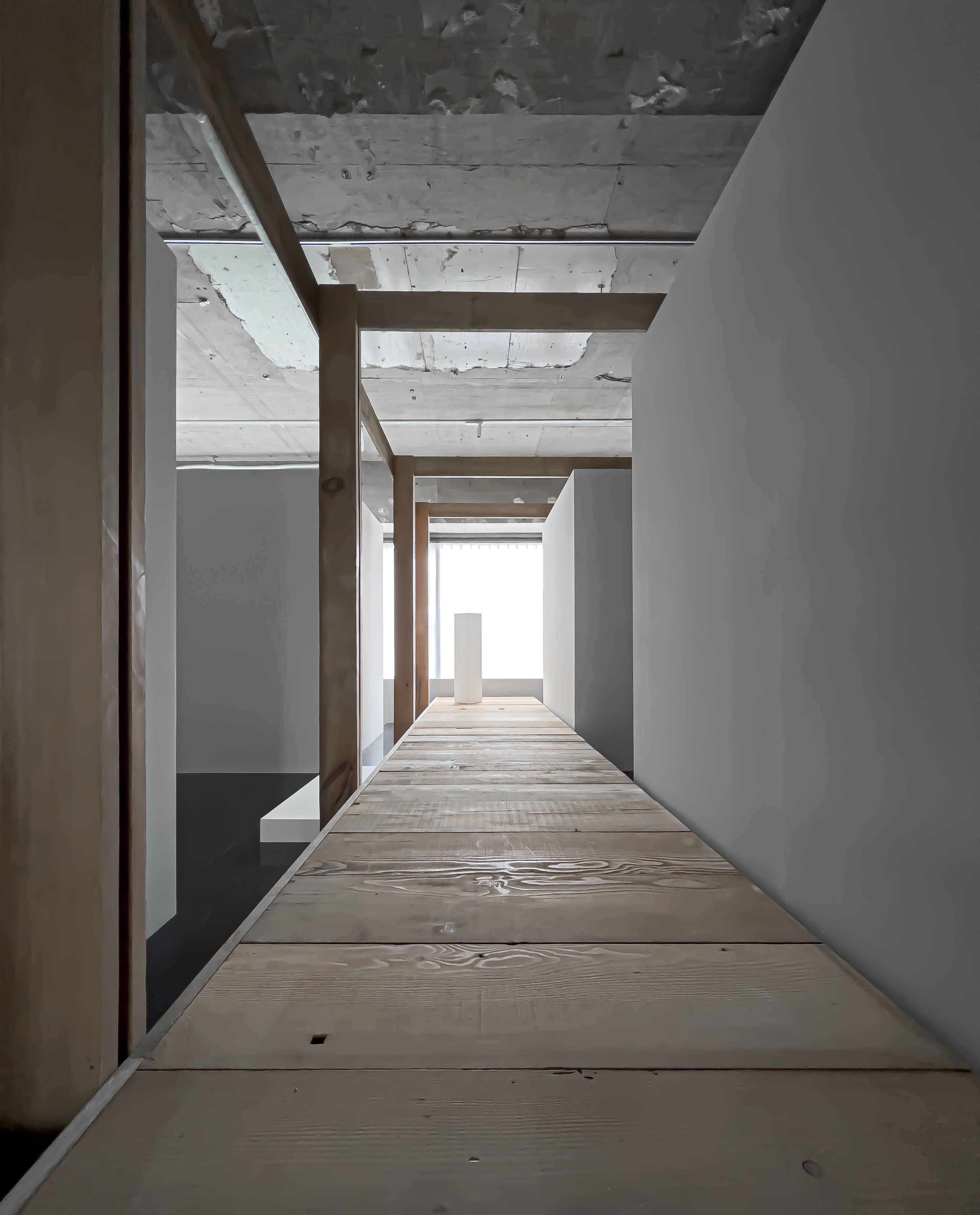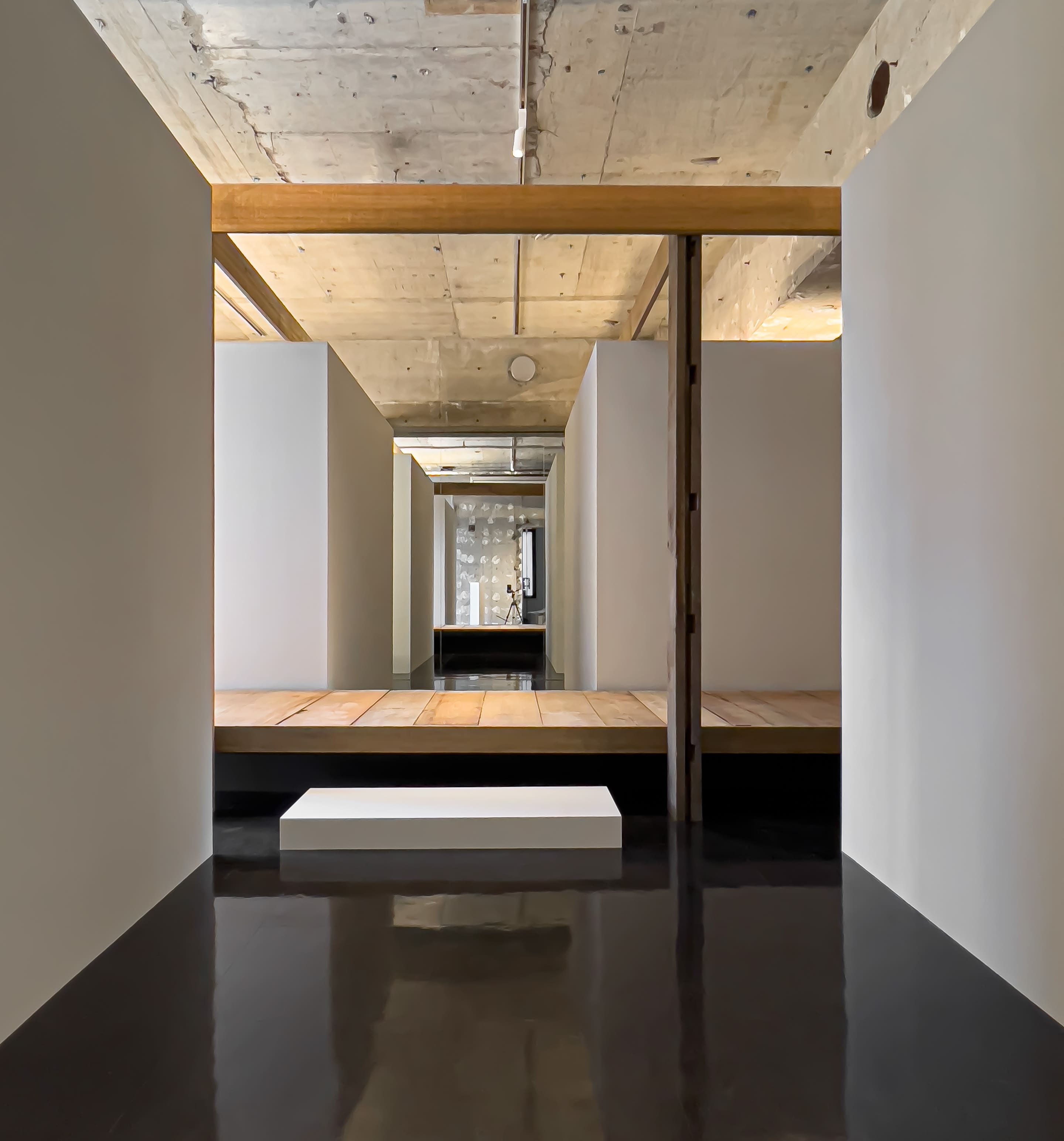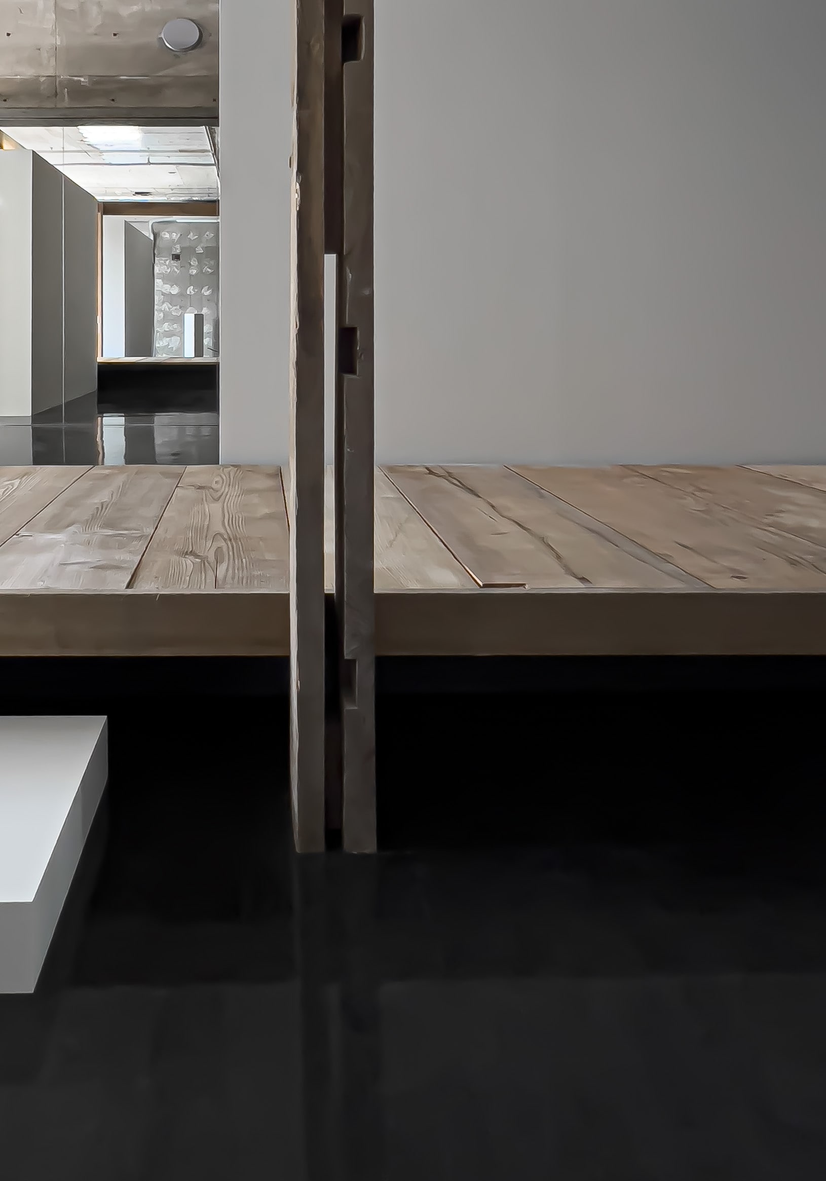 それらの要望をまとめ、4つの部屋を十字型の通路空間でつなぎ合わせる「田の字」レイアウトを採用。個室のプライバシーを高めることはもちろん、移動する際の期待感やリセットする時間など通路空間での体験に着目して空間を構成した。黒い水盤を思わせる空間から、桟橋を思わせるウッドデッキの空間に進むと、先にはルーフバルコニーからのふんだんな自然光が待ち受け、そこから脇に降り個室へと進む導線をデザインした。進むに連れてシーンの変化が現れ、記憶に残る空間となっている。また、デッキや柱には木造住宅の解体時に取り外した古材を使用。加工や経年変化の跡、色ムラ等はそのまま使用し、外にいるような印象を空間に添えている。