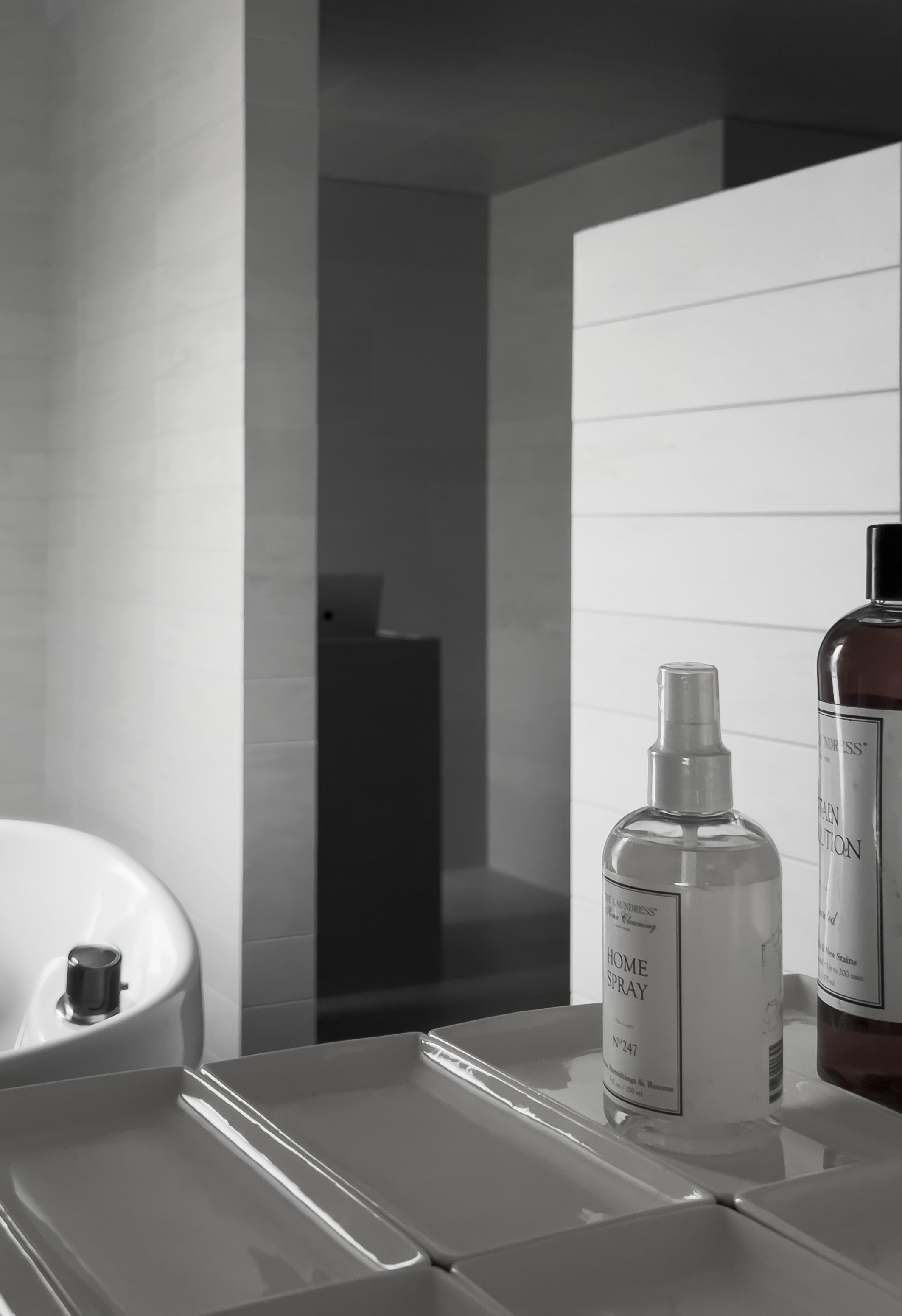 とくにグレー色へのこだわりは強く、お客やそこで行われるサービスが主役として引き立つ空間を、との理念が込められている。