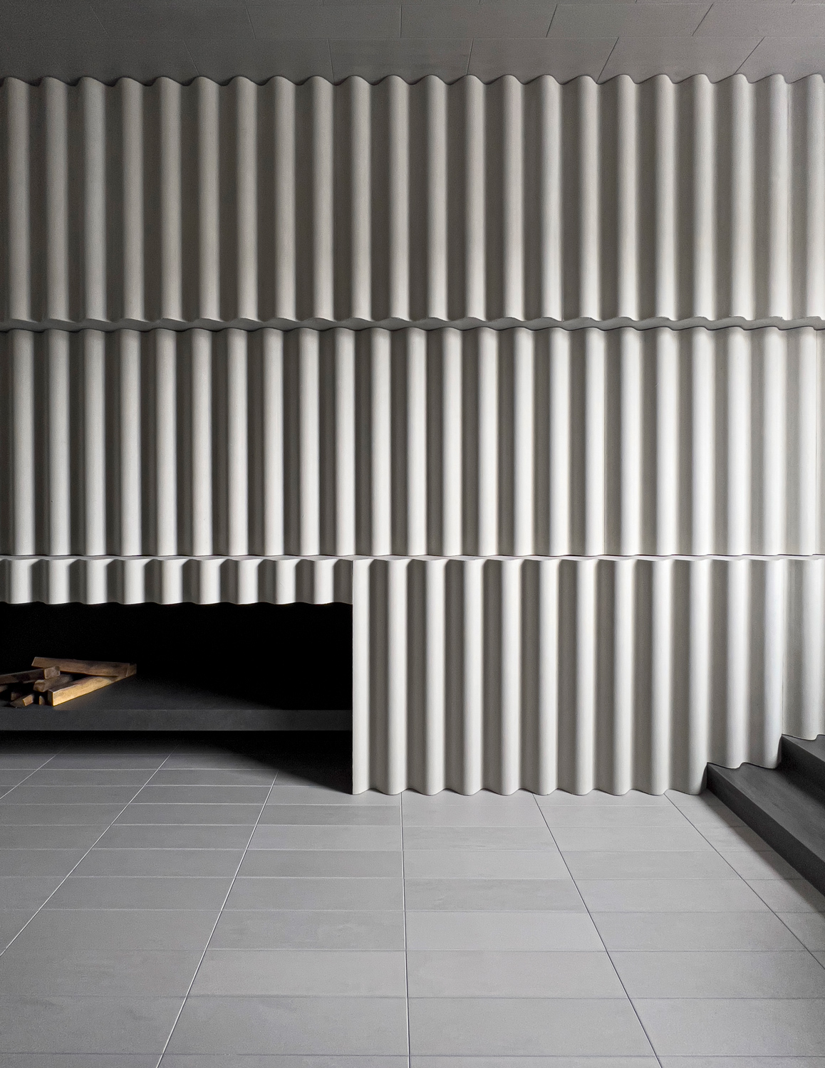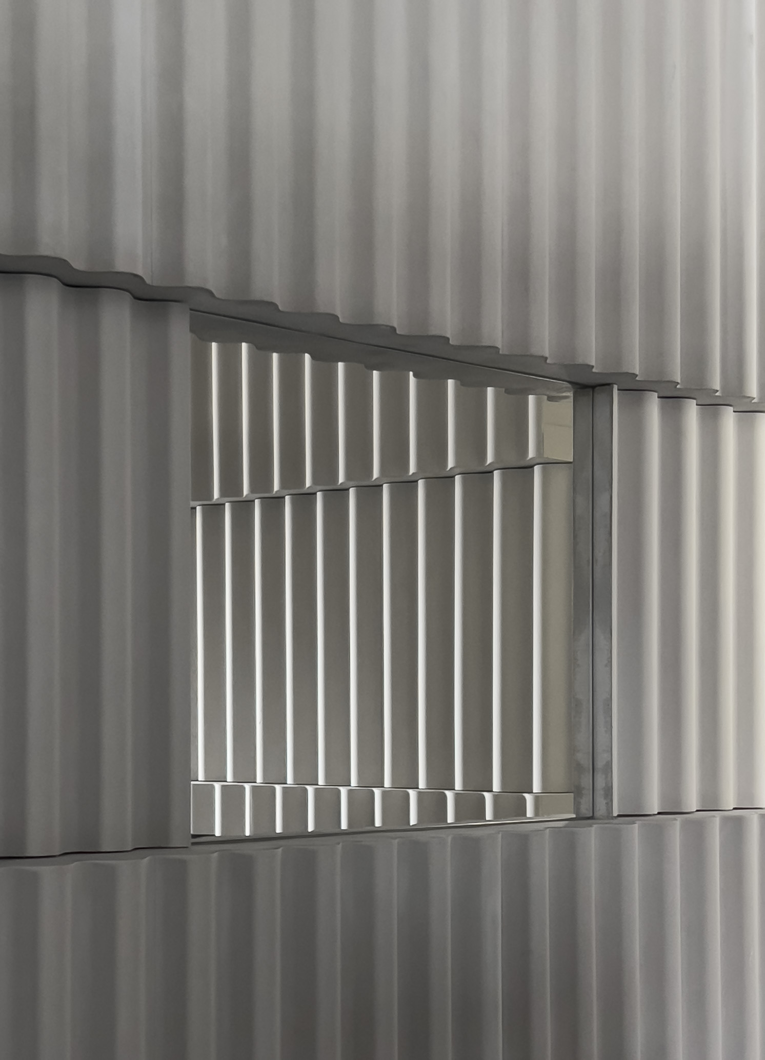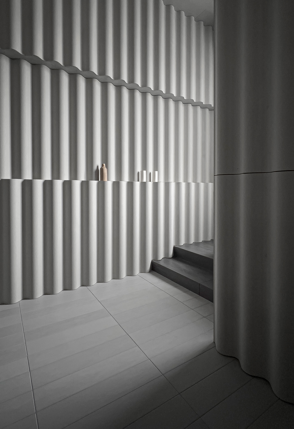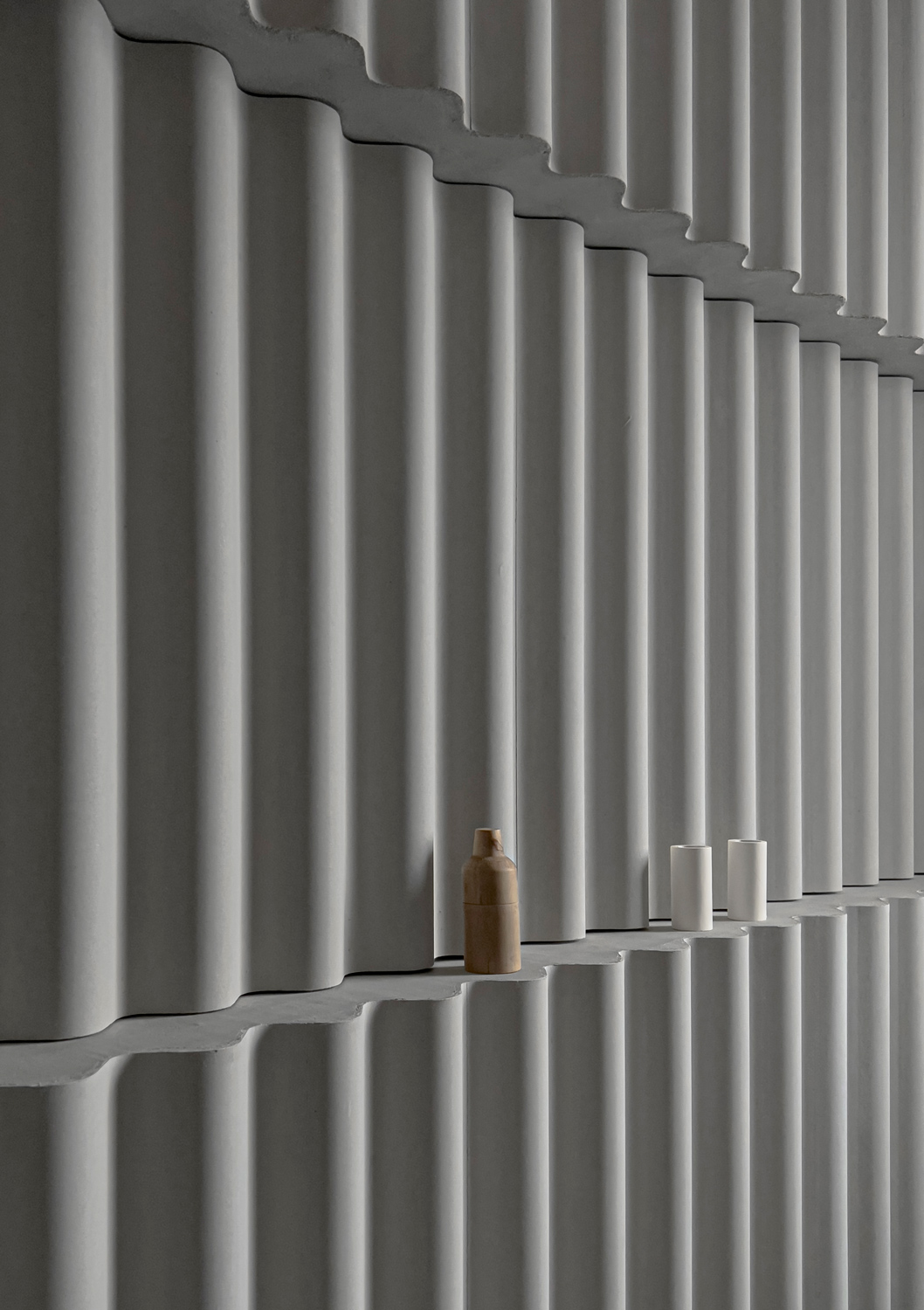 店名の「Hui」はハワイの言葉で「集まる」の意。そこから着想して、主要な素材に「波板スレート板」を採用。グレー色の空間に、採光が落とす陰影のグラデーション(とその連続)を添えた。ここでは波の振幅に着目。まず壁を3段に分け、中段をセットバックし半波分をズラす。できた隙間をモルタルで埋めマッシブな表現とし、陰影と併せて立体感・重量感・オリジナリティを演出している。また、2つの波がズレ、それぞれ広がった箇所で生まれる奥行を活かし、商品ディスプレイや眼鏡置きなどの棚機能に充てた。