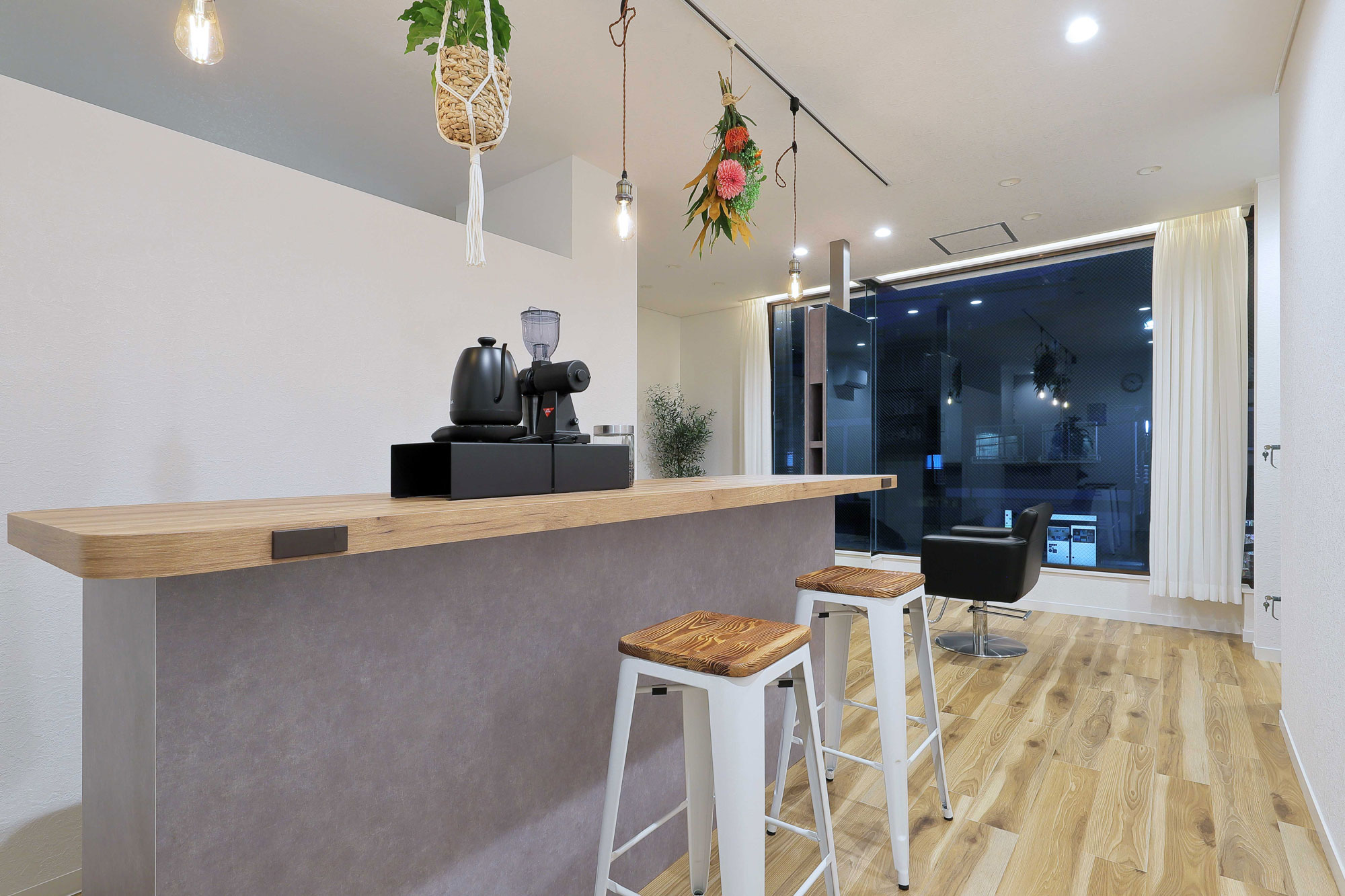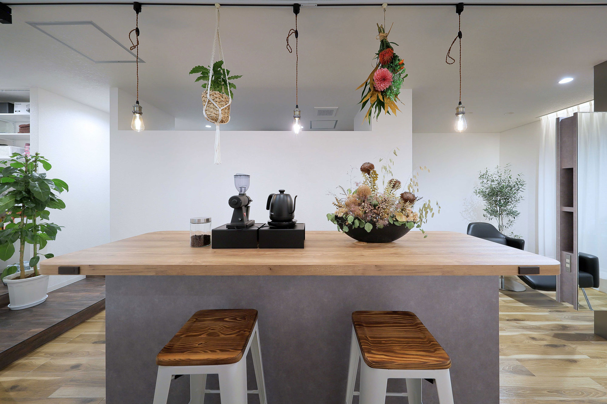 エントランスには大きなカウンターがあり、受付といった概念を無くし、住まいのキッチンカウンターのように、お客様と対話をしたりカフェの様にリラックスできる場所を設け、サロンのコンセプトをアピール。