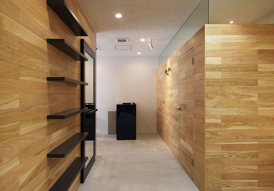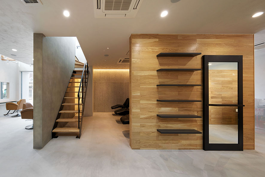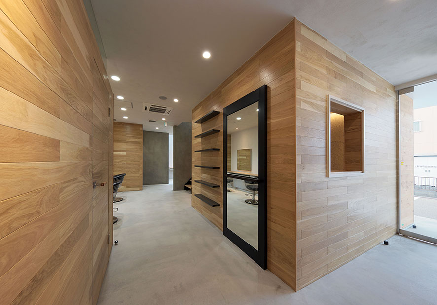 移転新装工事の案件。移転前店舗の内装も担当しており、そこで使用した仕上げ材を利用しつつモルタル、木目を新たに使用して欲しいという要望があった。木造のためレイアウト制限が強い中で、柱をできるだけ消しつつ空間に広がりを持たせるよう計画した。壁面の仕上げを、モルタル風と木目を対比的に扱いながら、同時に吹き抜けで上下方向の広がりを、ミラーと大きな窓面で水平方向の広がりを確保するよう計画した。