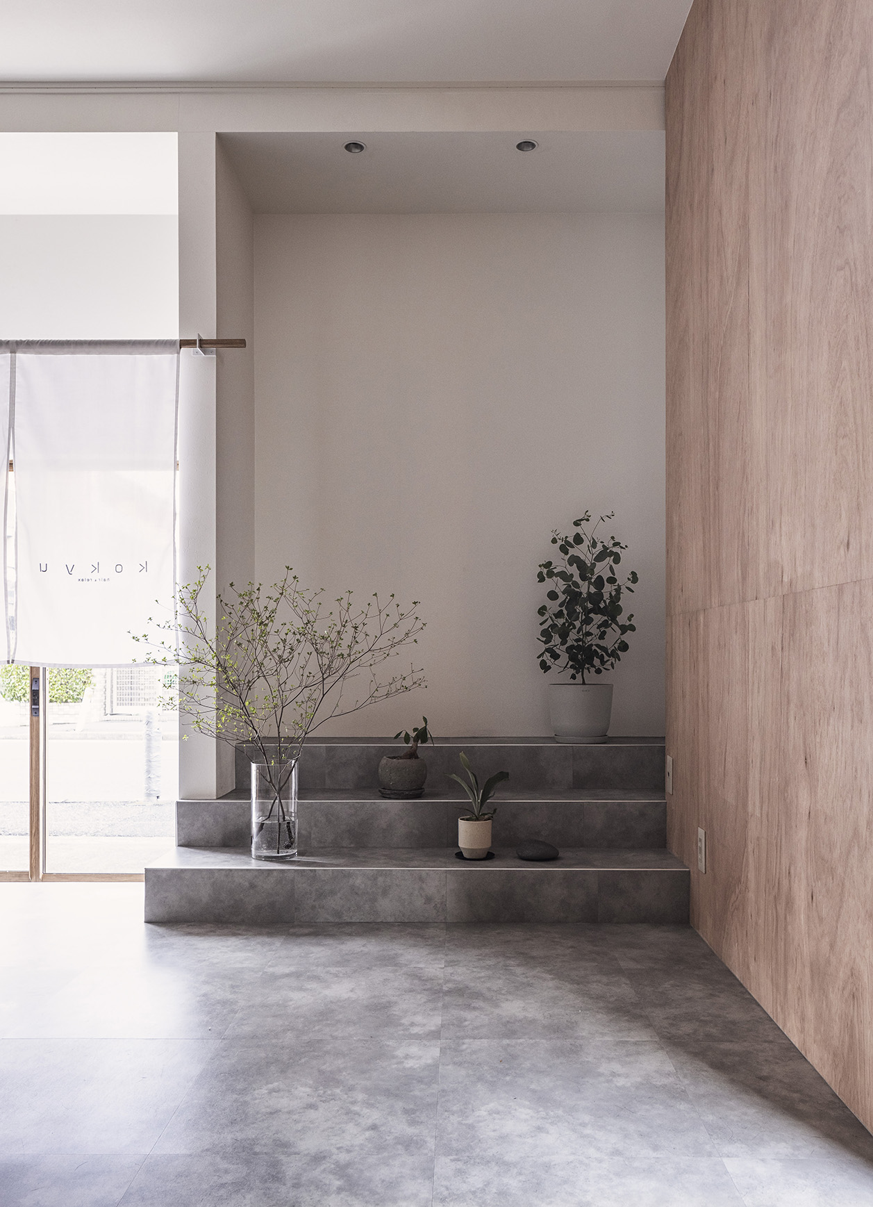 視覚的効果をもたらすお庭を境にテナントを3分割に分けて考え、中央に位置する施術エリアを作り込むような計画とした。これは事務所仕様のテナントをなるべく生かしながら、限られた予算に近づけるためでもあった。約4坪程度の施術エリアを壁紙の色味や天井造作で他の空間とコントラストをつけ、よりプライベート感を向上させた。シンボリックな大きな柱は、外からの視線を遮る役目を果たしつつ施術に必要な商材や道具の収納、レジ機能を兼ね備えている。