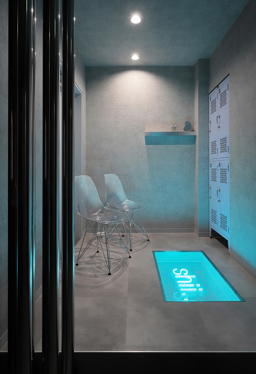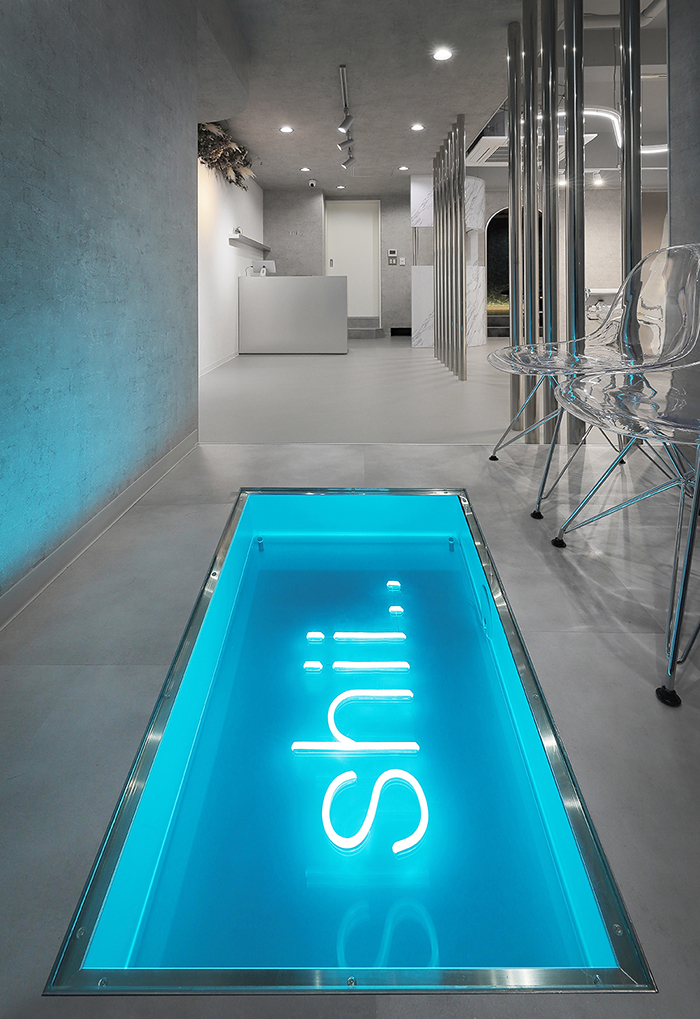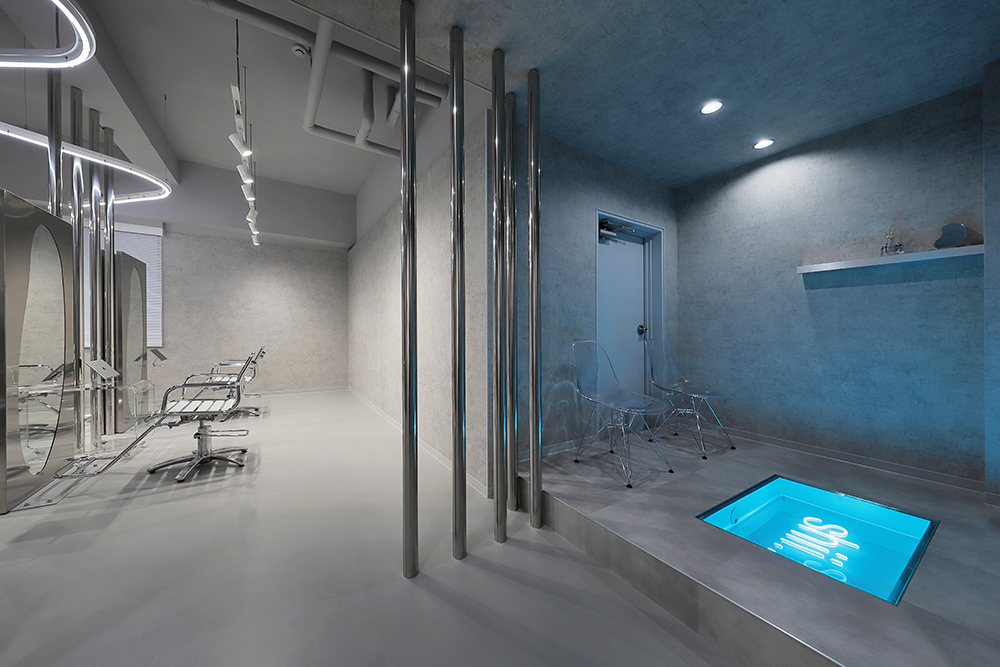 ウェイティングの水色から奥のシャンプーブースの濃紺へ、海面から深海へと向かう配色で期待感を高めている。