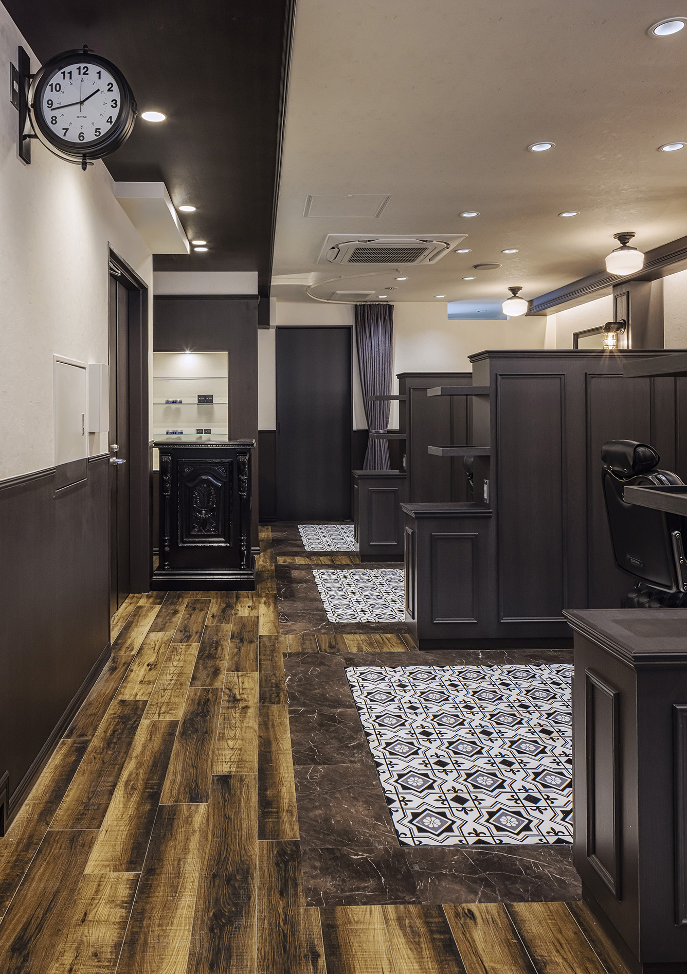 濃い木目の面材家具で各ブースを仕切り、クラシカルなシーリングライト、ブラケットライトを散りばめた。そして、タイル柄のオリジナルプリント塩ビタイルが独自性を演出している。幅広い年齢層の支持を得たメンズサロンとなった。
