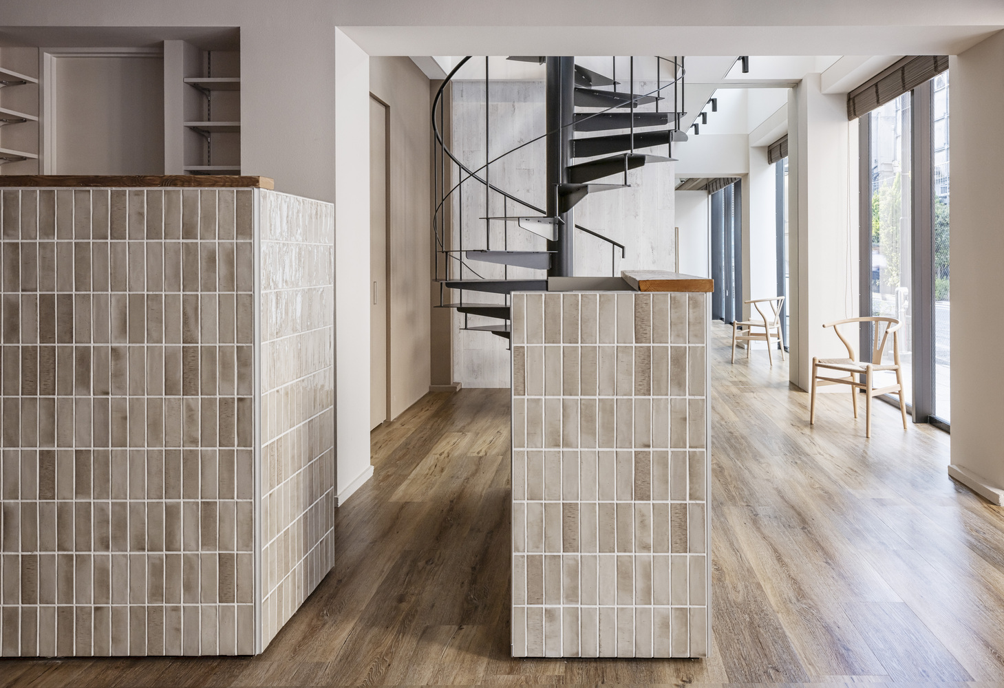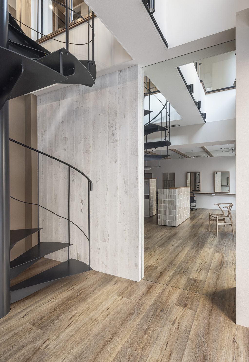 立川といえば多数の路線が入り混じる、西東京の玄関口と言える。大型の商業施設やオフィスビルもある一方、少し歩けば記念公園や多摩川という水と緑に囲まれた都市となっている。そこで街並みの要素を空間に取り込むことで立川との共存を図った。受付や作業台の家具・螺旋階段はさまざまな高低差が立ち並ぶ建物を連想。天井の小梁は多数の道路が交差している道を連想。床やカウンターなど随所に緑を連想させる木目を取り入れ、訪れる人に違和感なく居心地の良い空間を提供した。