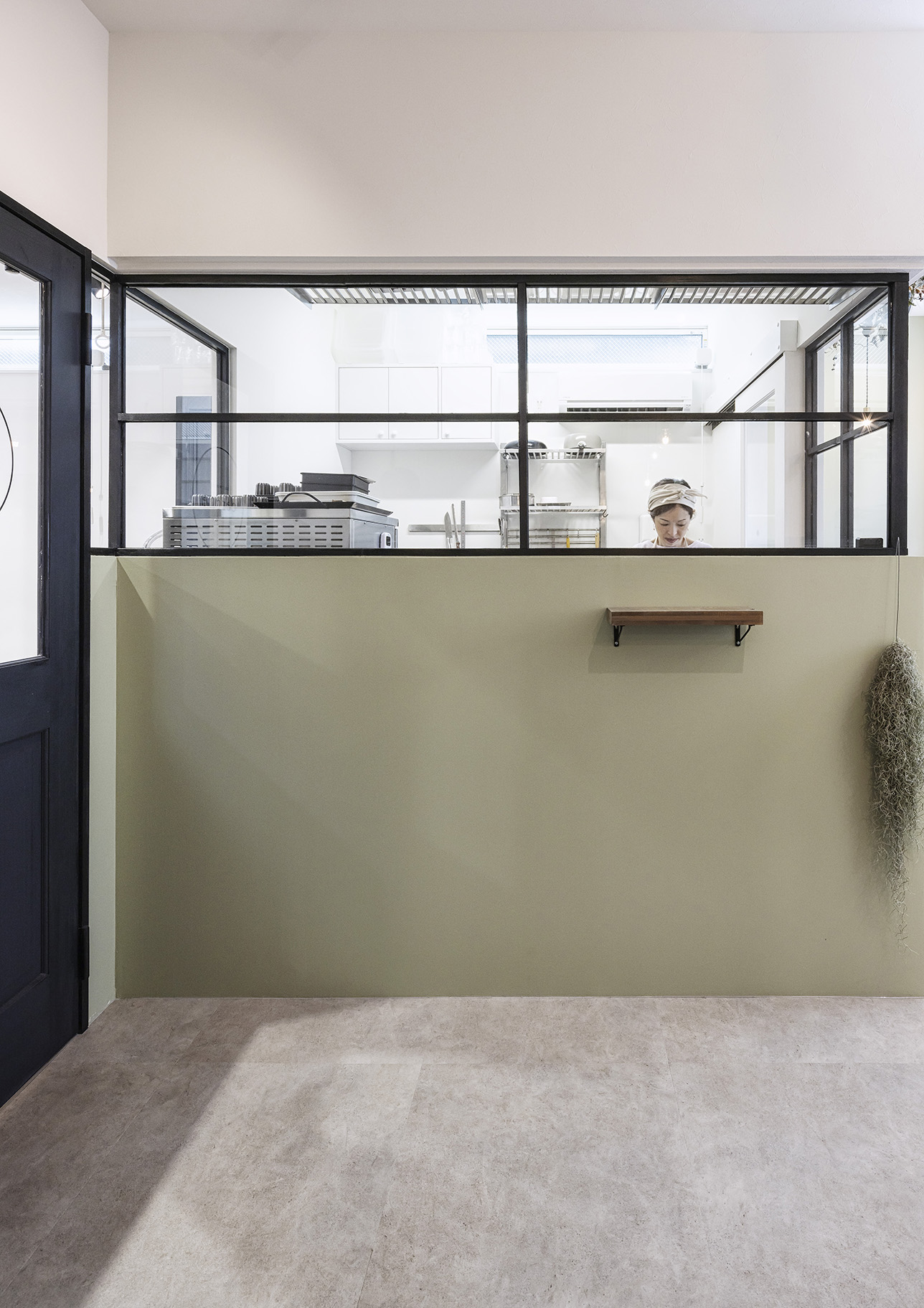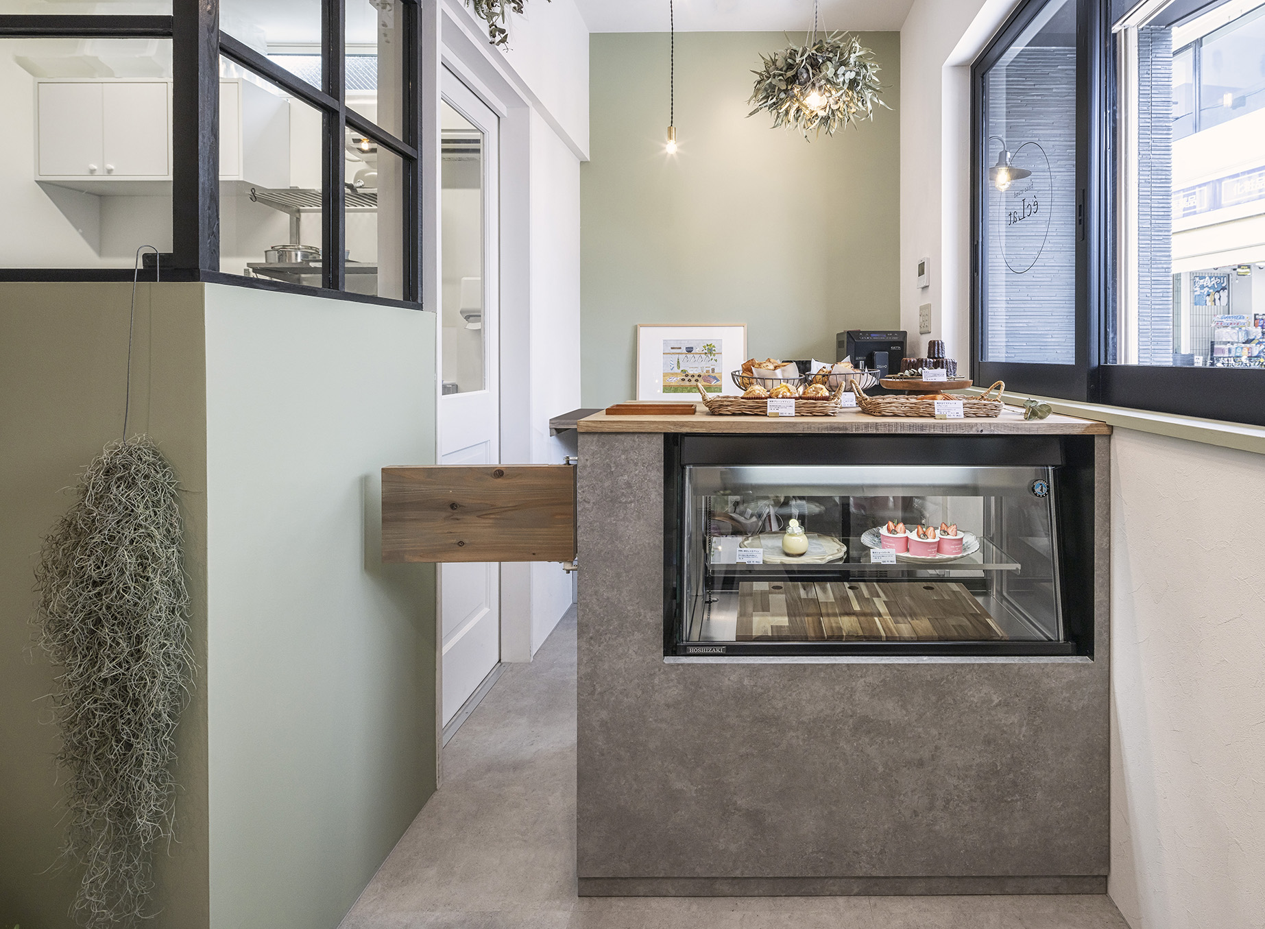 そこで、厨房を背景にサロンで施術を受け、帰り際に洋菓子を手に取れるよう設計した。