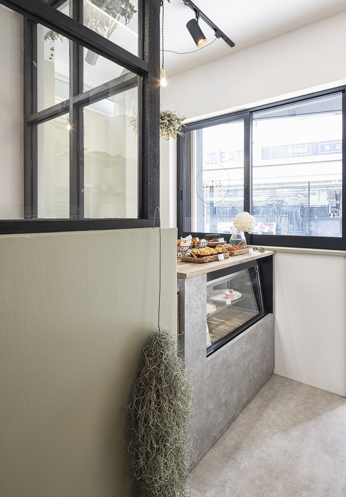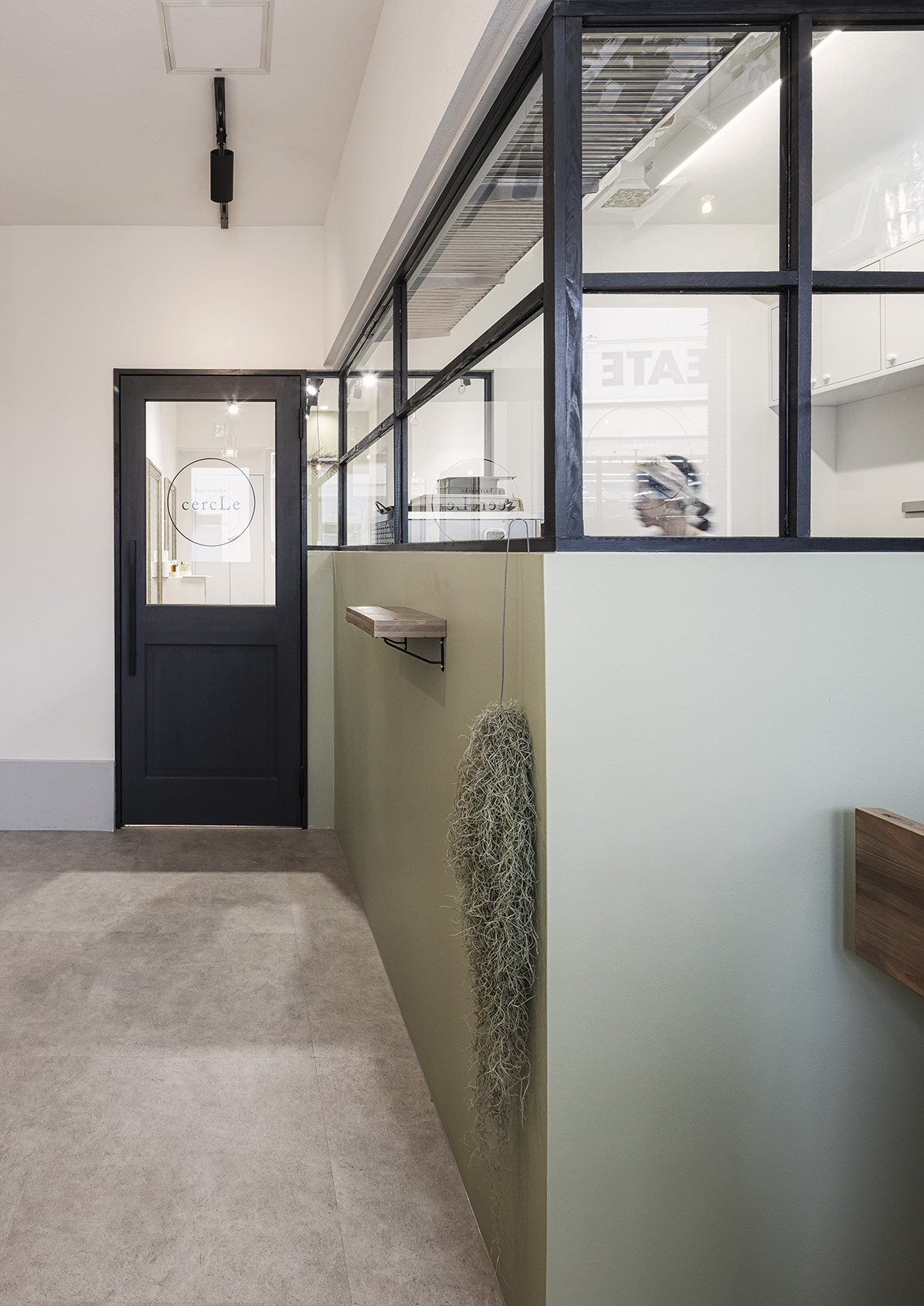 洋菓子スペースと美容室で少し雰囲気は変えつつも、共通点を散りばめることで夫婦ならではの空間とした。