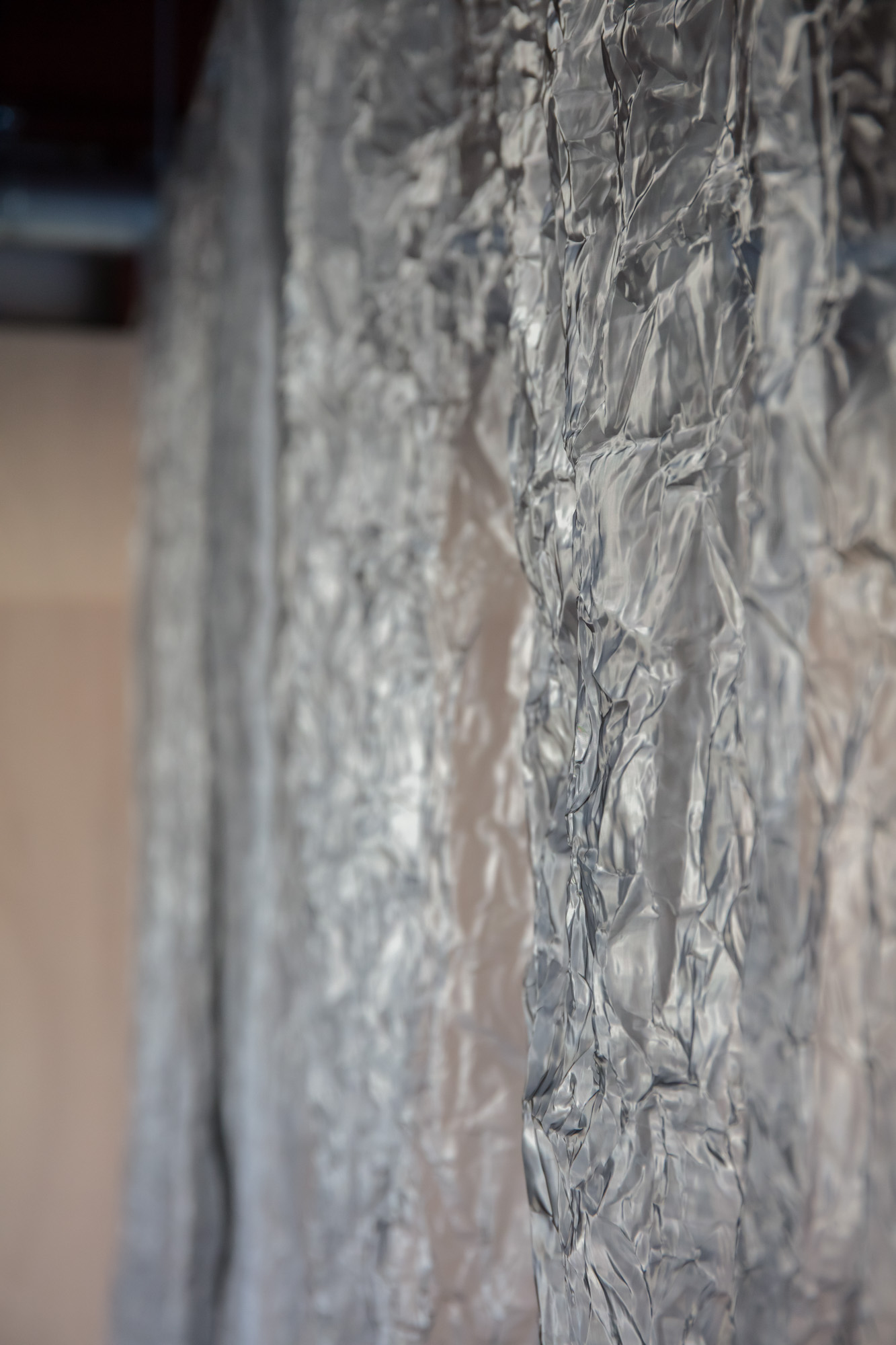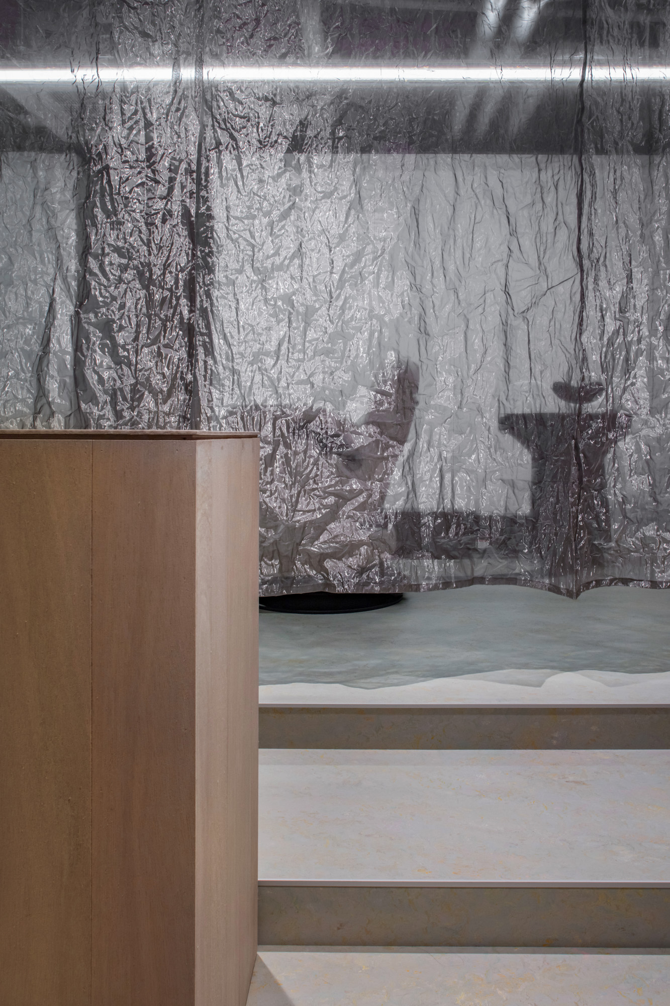 セット面は床を三段上げることで「舞台」のように演出することとした。外部とレベル差をつけることで、お客さまにセット面へ向かう期待感をもたせる。 また、その途中に金属メッシュ製の幕を吊り下げることで、程よい透過感と距離感を持たせることができる。