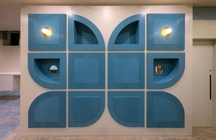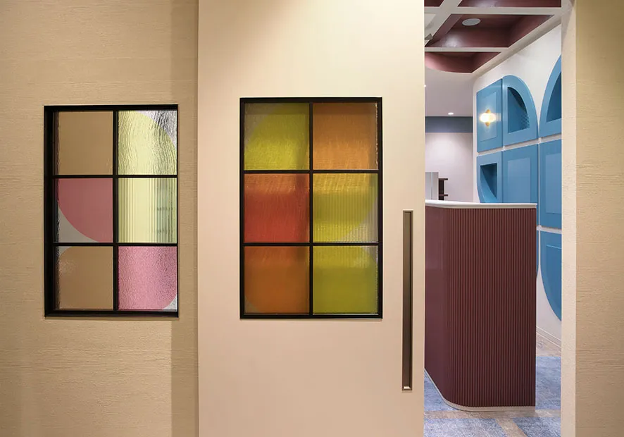 一枚の紙に違うジャンルの内装イメージが貼ってあり、それを起点に空間をデザイン。内装の要望を全て混在させ、切って貼ったように蝶のアイコンを分割し、各所に散りばめる提案をした。