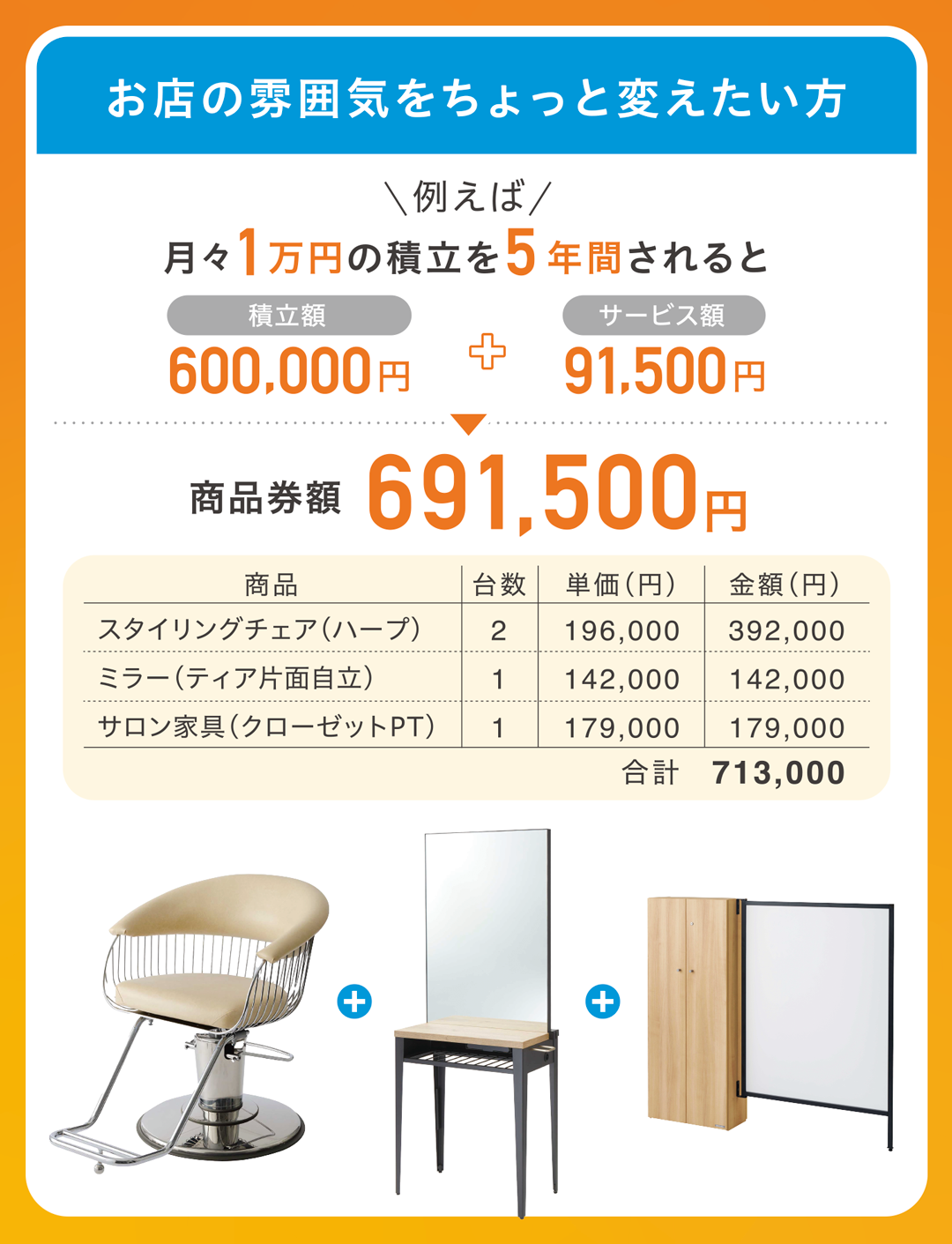 - サロン様の喜ばれる姿を見ると、こちらも幸せな気持ちになります。サロン様にとってはメリットばかりなので、ご縁のあったサロン様には「転ばぬ先の杖」と必ずお勧めしています。次期構想をお持ちの方には5年後にこのくらい積立できていますとご説明するようにしています。修理が発生した時だと、実際どのくらい積立てればいいかをイメージしていただきやすく、理解も深めていただけます。またユメイクをご利用された後、「助かったよ」と喜ばれる姿を見ると、こちらも「お勧めしておいてよかったな。」と幸せな気持ちになります。
