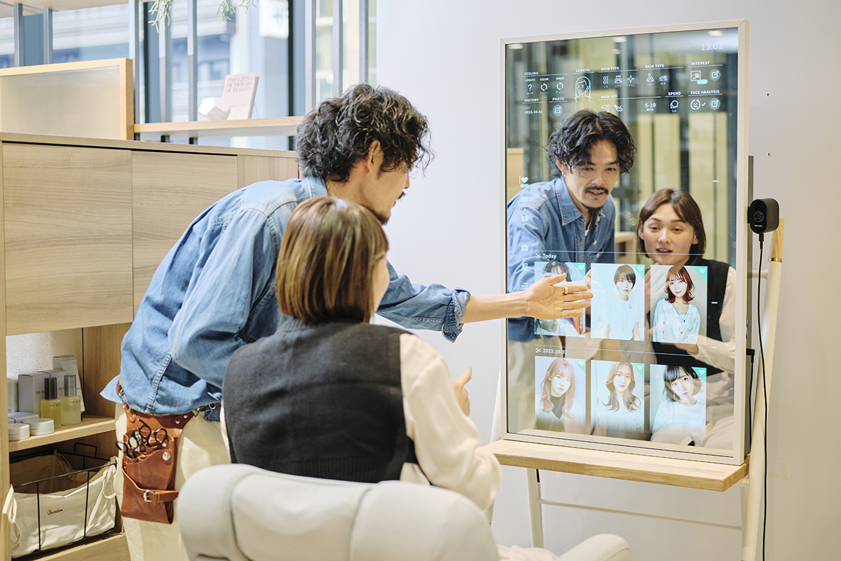 ミラー上では、AIを用いた「顔診断」「カラーシミュレーション」で新たな自分のスタイルを発見することも。また、理美容師が顧客の好みに合わせて「マイフォルダ」から自身のポートフォリオを照会することもできるため、理美容師自身の得意も引き出し、自信をもって提案することができます。 - さりげないきっかけを生み出す